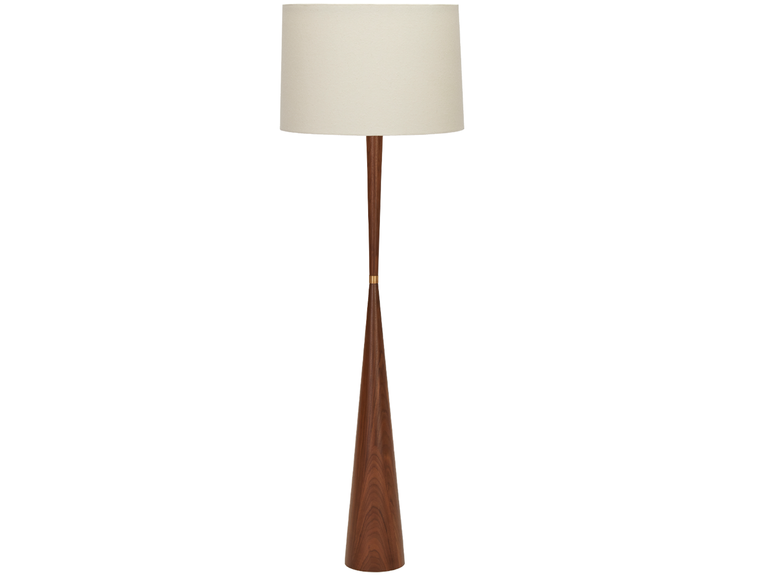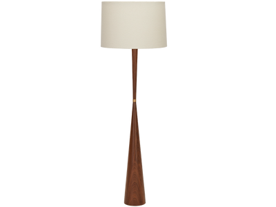The El Monte Lamp is made from turned solid American Walnut or White Oak with a brass knuckle. The drum shade is linen and includes a diffuser.