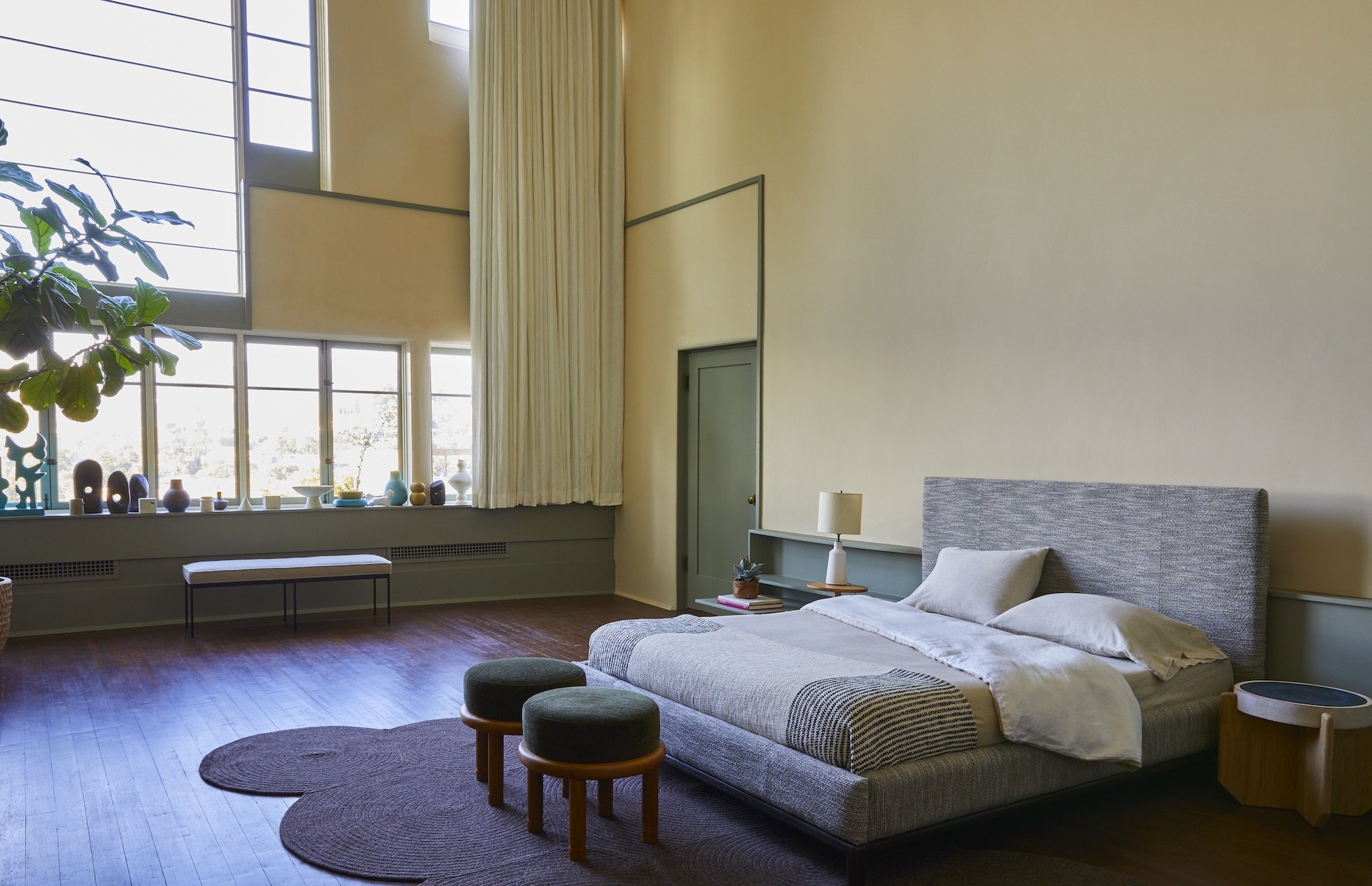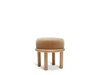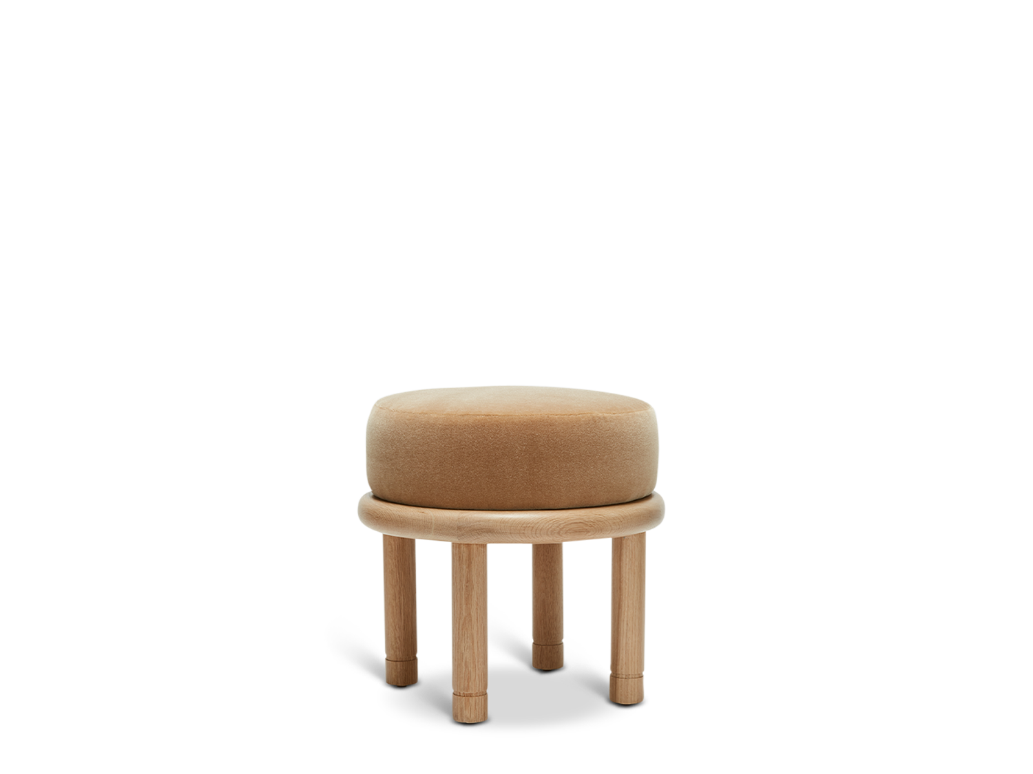 The Petite Moreno Ottoman features a round solid wood base with four cylindrical legs and an upholstered top. Available in American walnut or white oak.