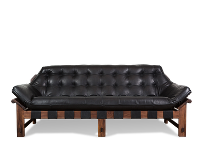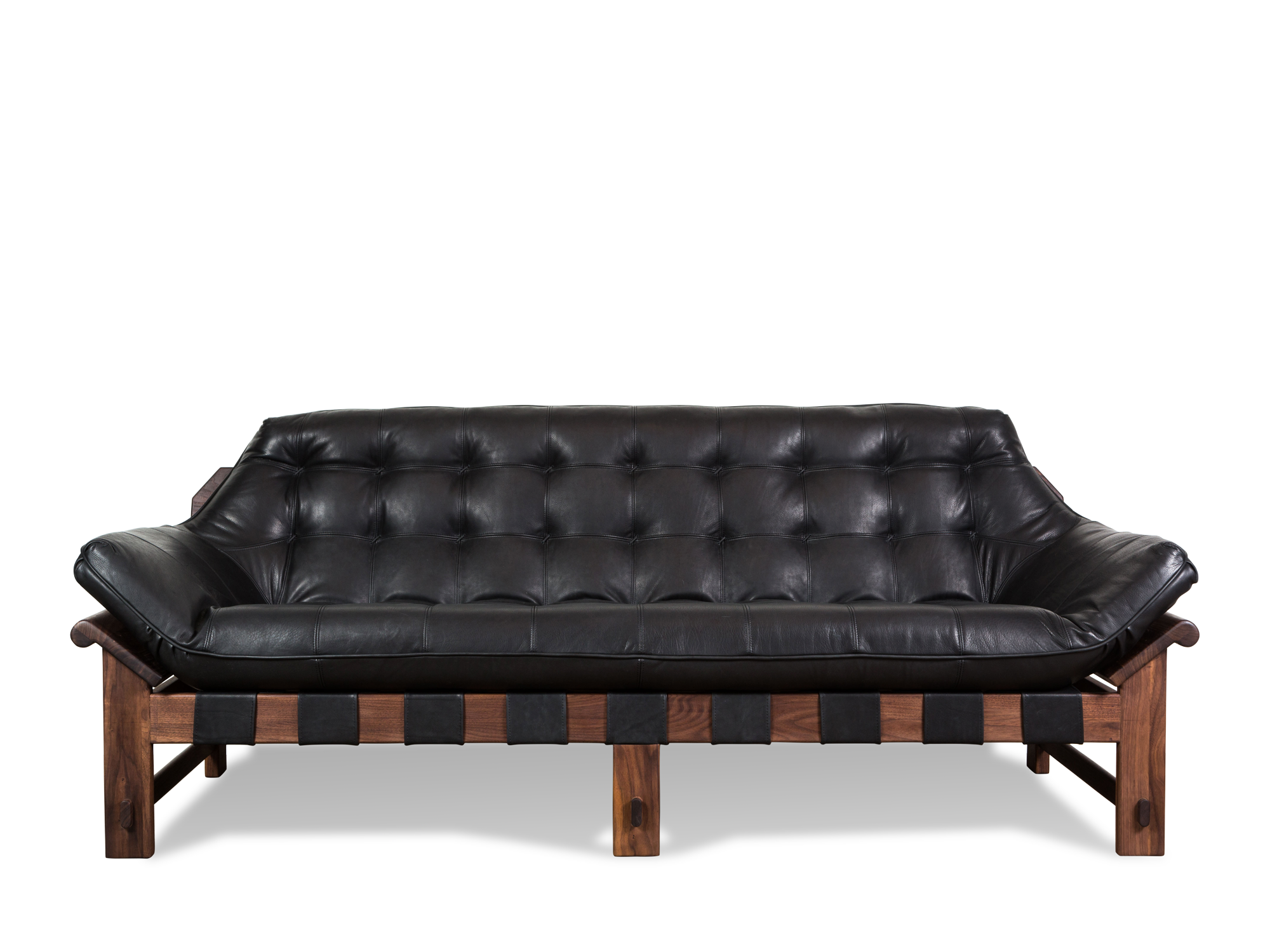 The Ojai Sofa features a solid white oak or solid walnut base and a single tufted leather cushion with leather straps.