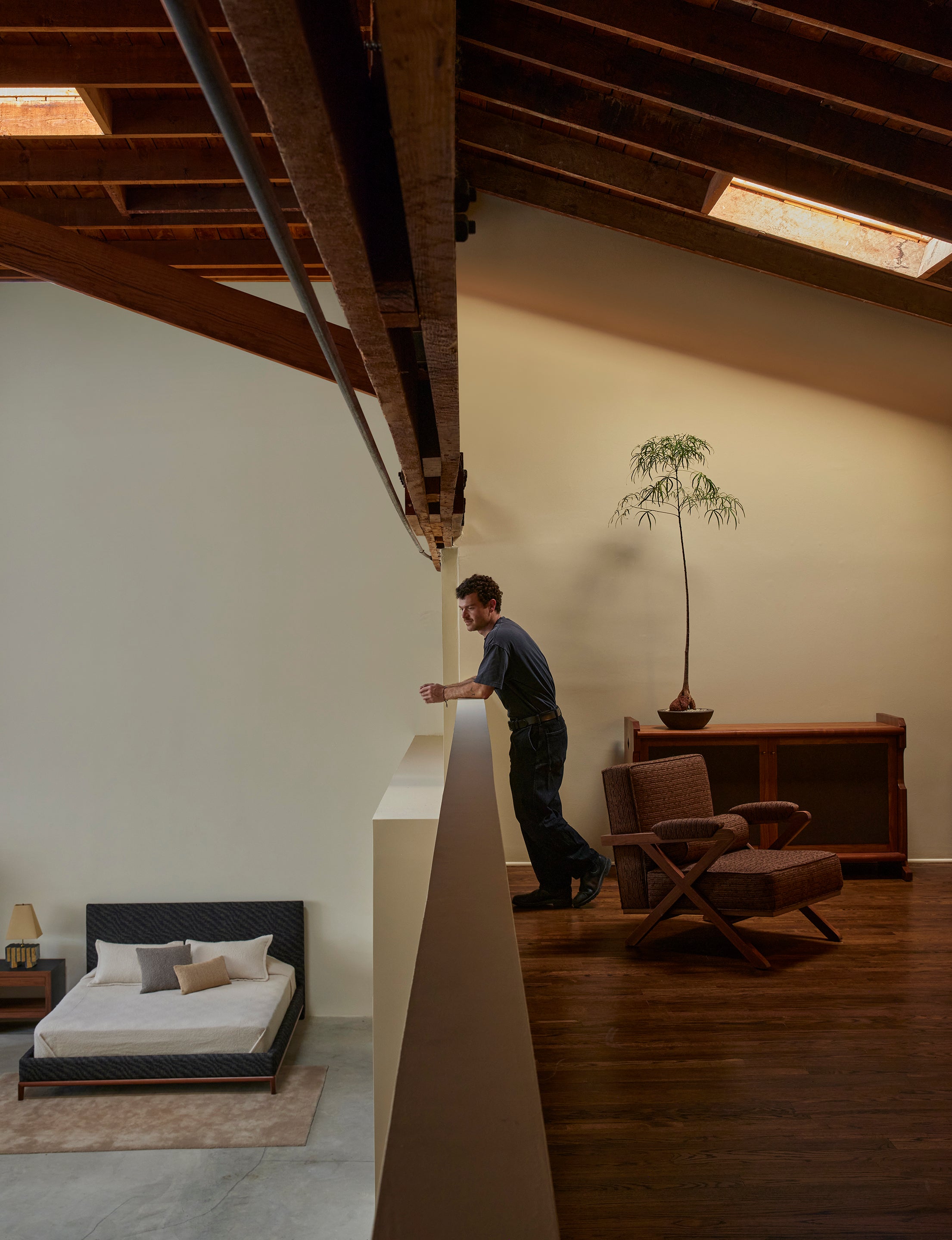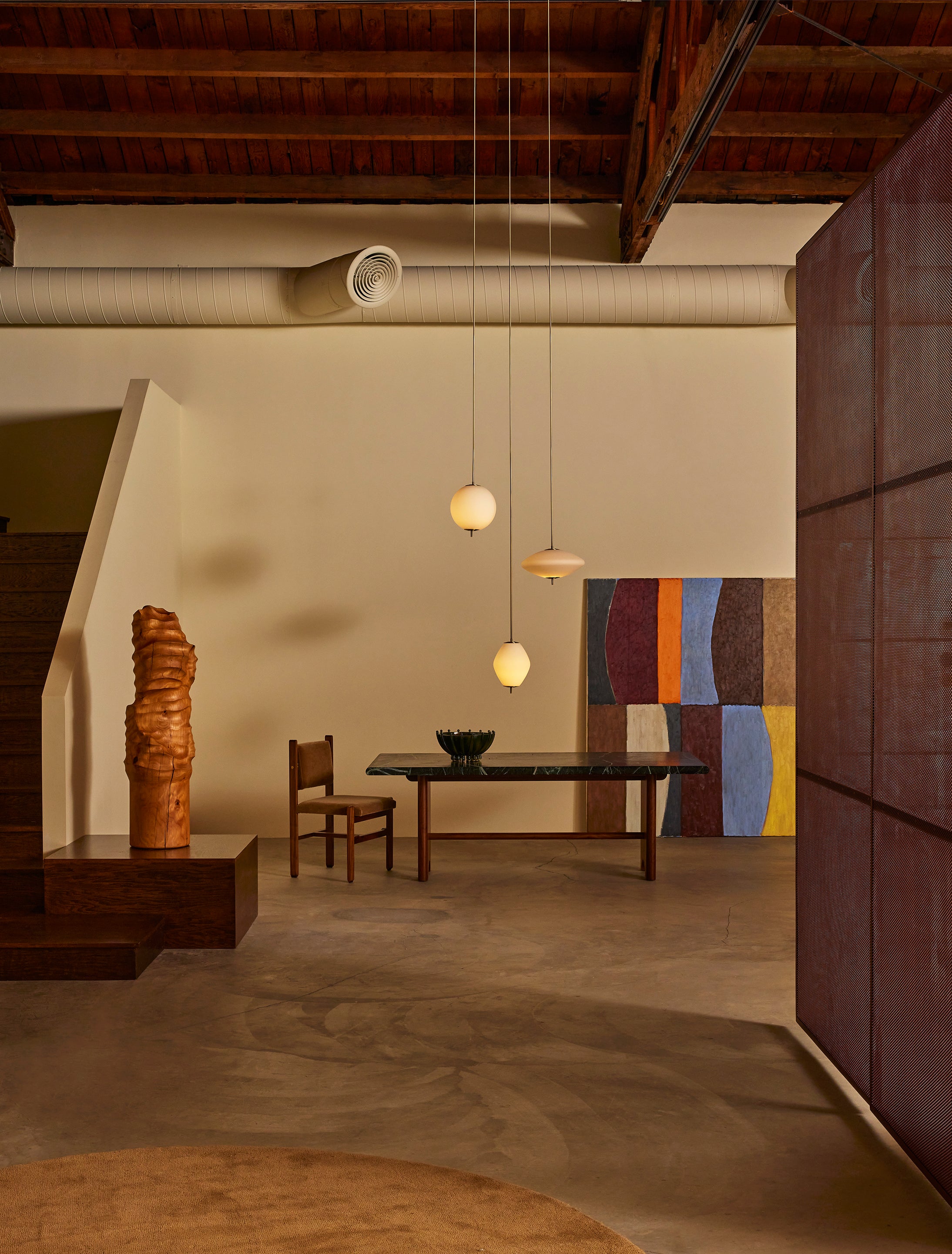 Housed in a 1930s bow truss warehouse with original unpainted wood ceilings and skylight.