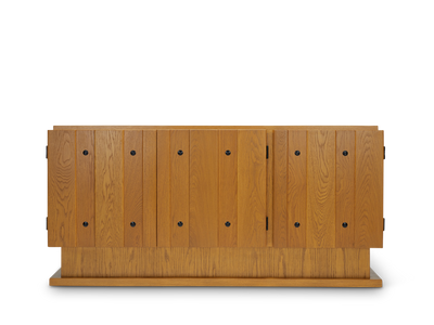 The 3-Door Ojai Cabinet features board and batten doors with iron details and adjustable shelves. Available in American walnut and white oak. Inspired by the refined simplicity and subtle detailing of early 20th century Swedish furniture designer Axel Einar Hjorth.