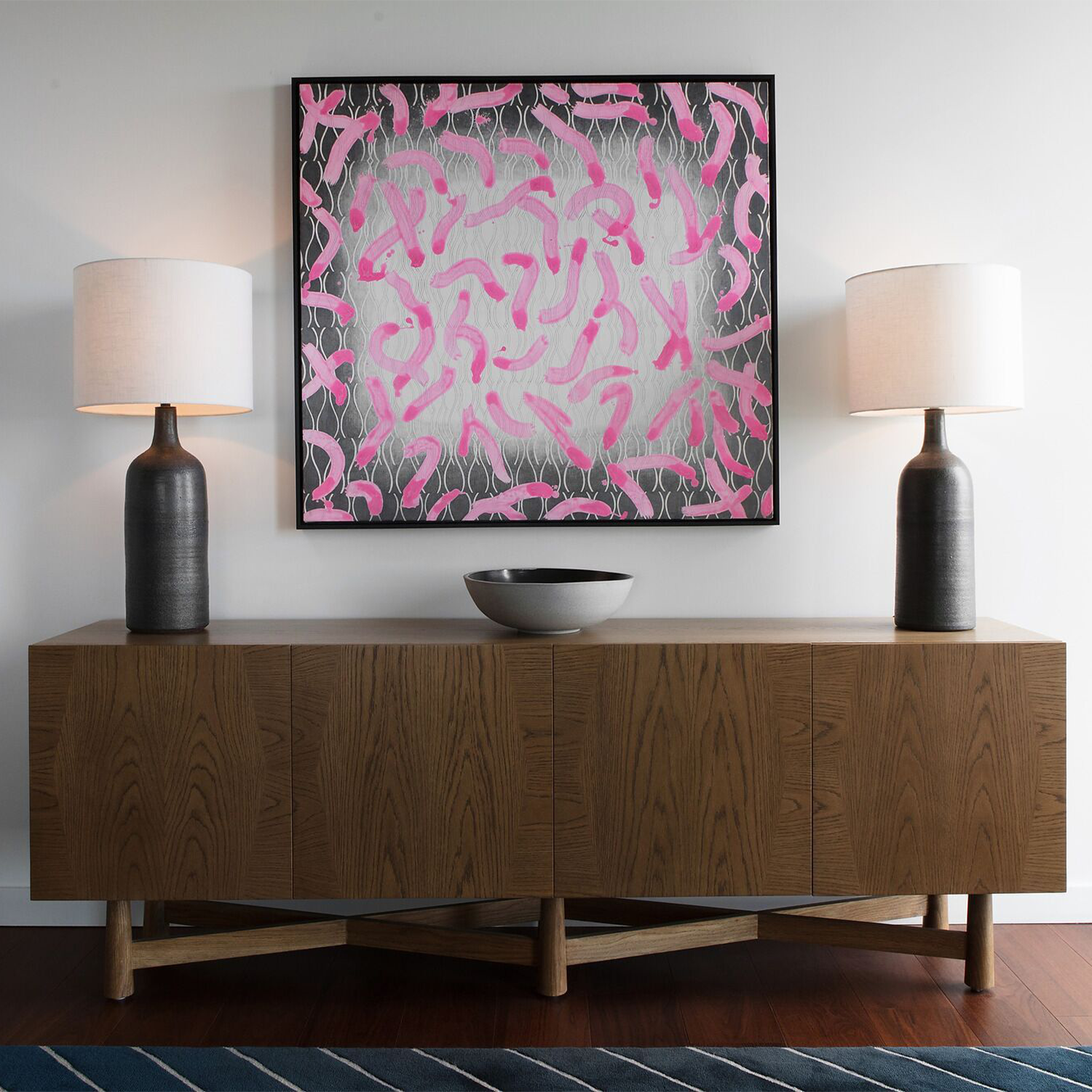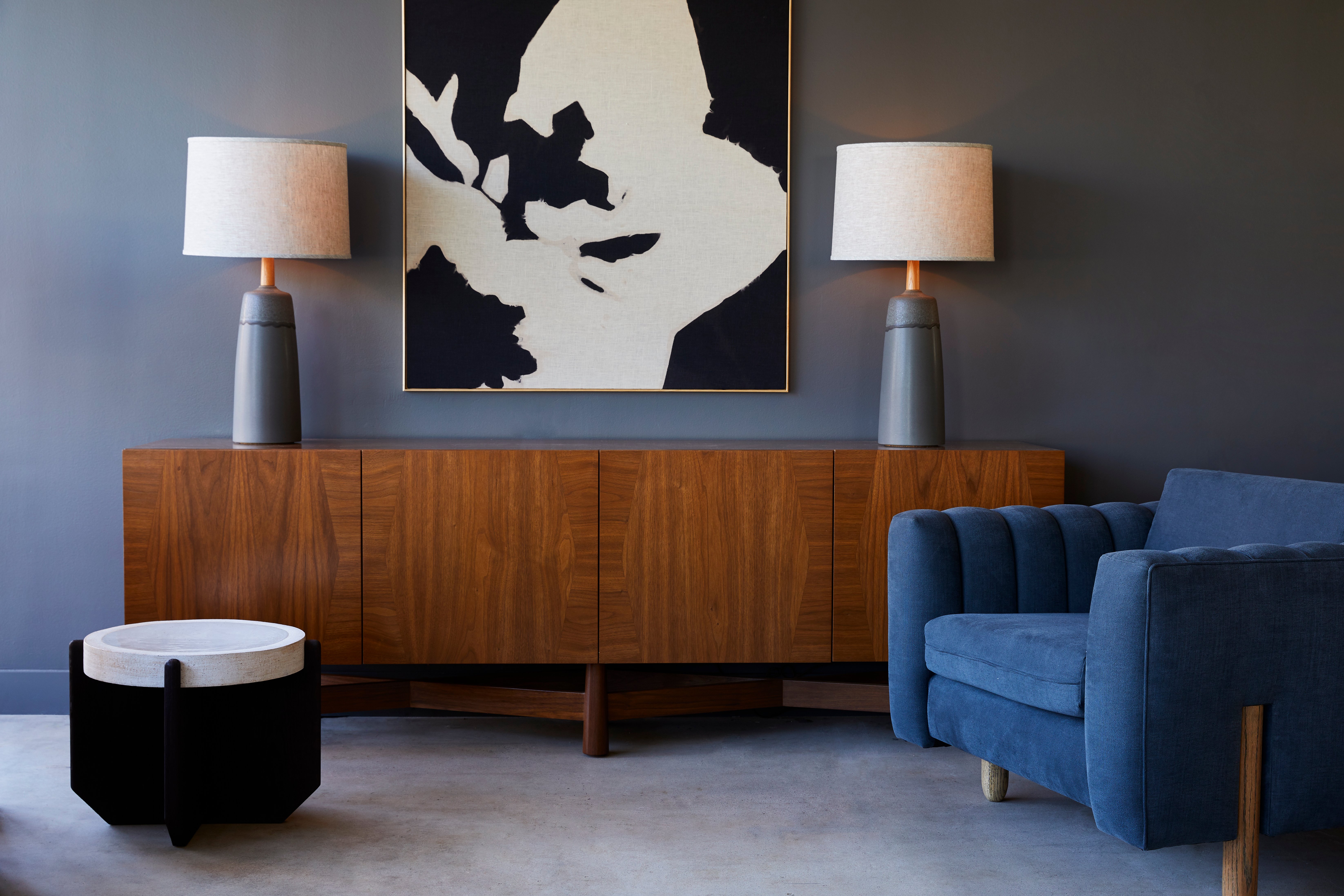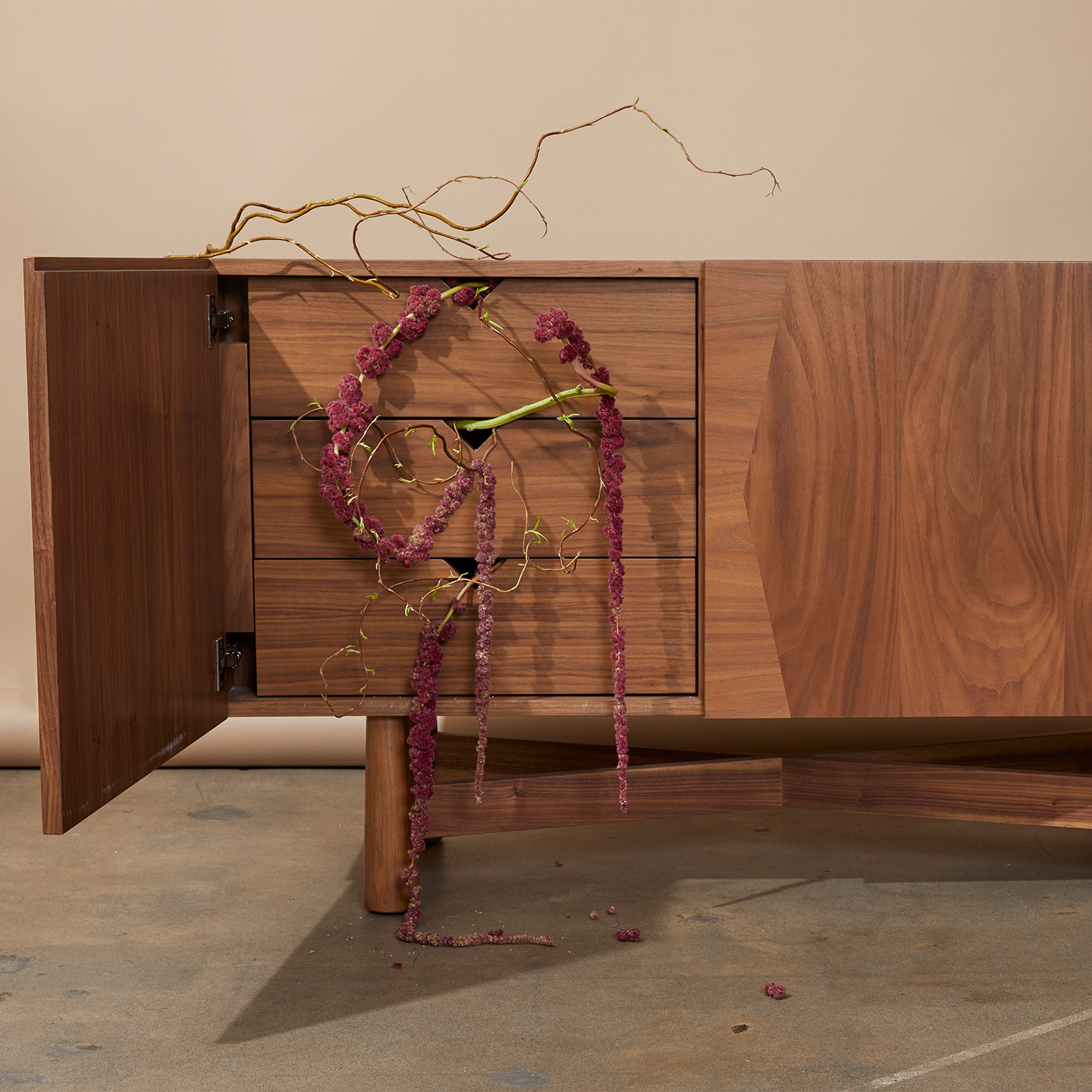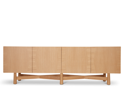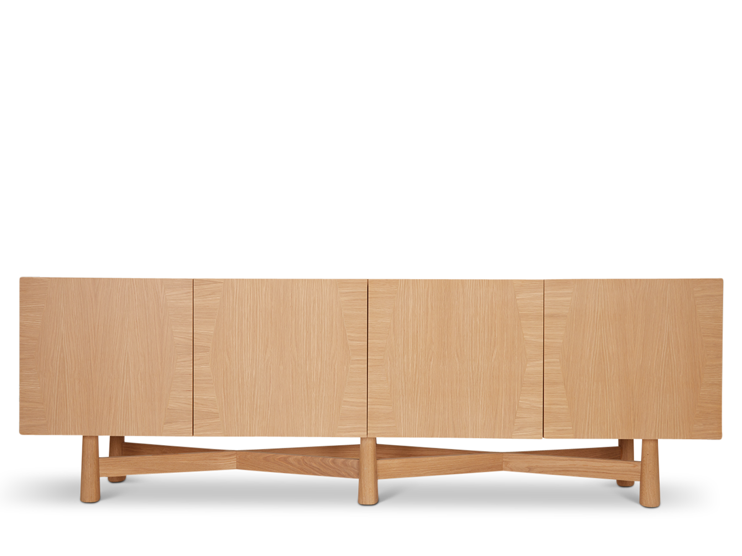 The 4-Door Bronson Cabinet has three drawers and four doors that feature a parquet detail on the front of the case. Available in American walnut or white oak.