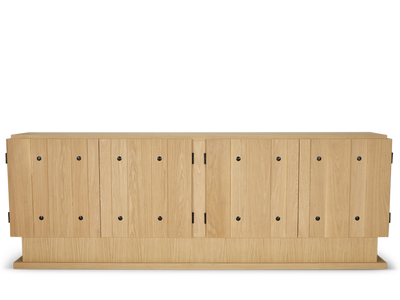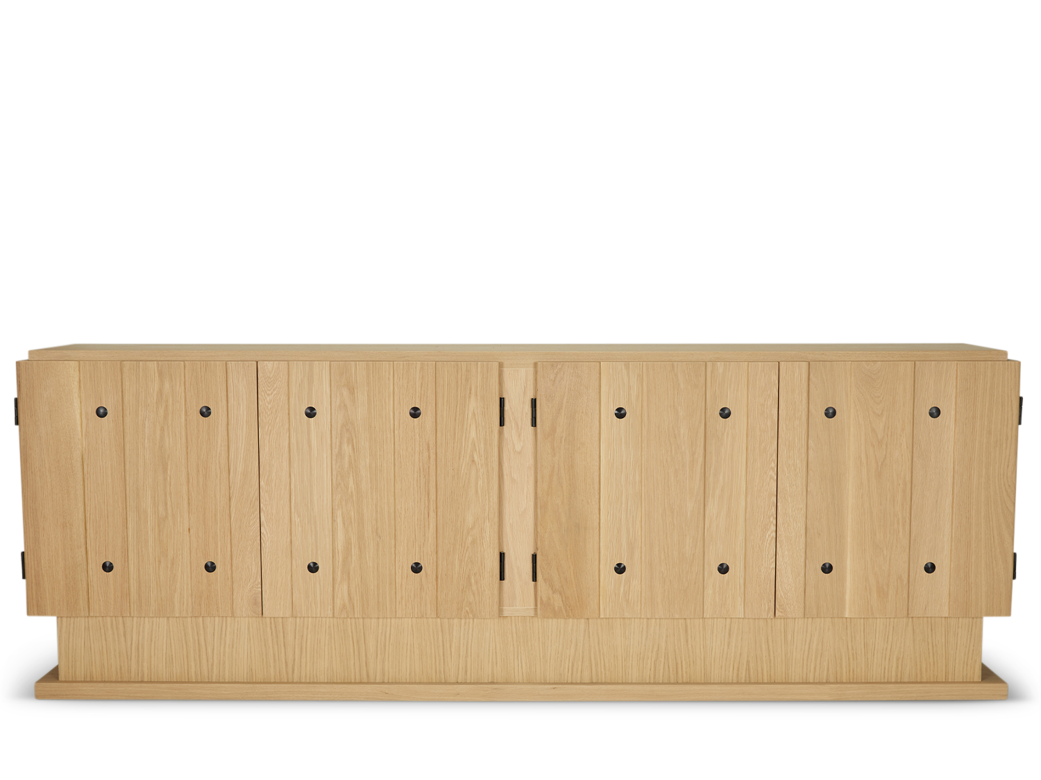 The 4-Door Ojai Cabinet features board and batten doors with iron details and adjustable shelves. Available in American walnut and white oak.