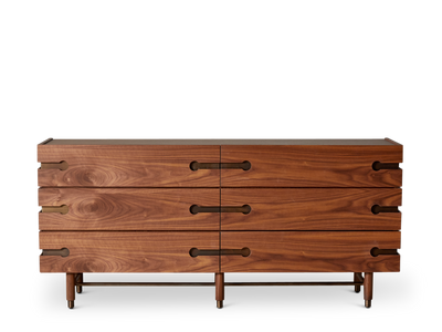 The 6-Drawer Niguel Dresser features 6 drawers, brass cap feet, and brass inlaid details.