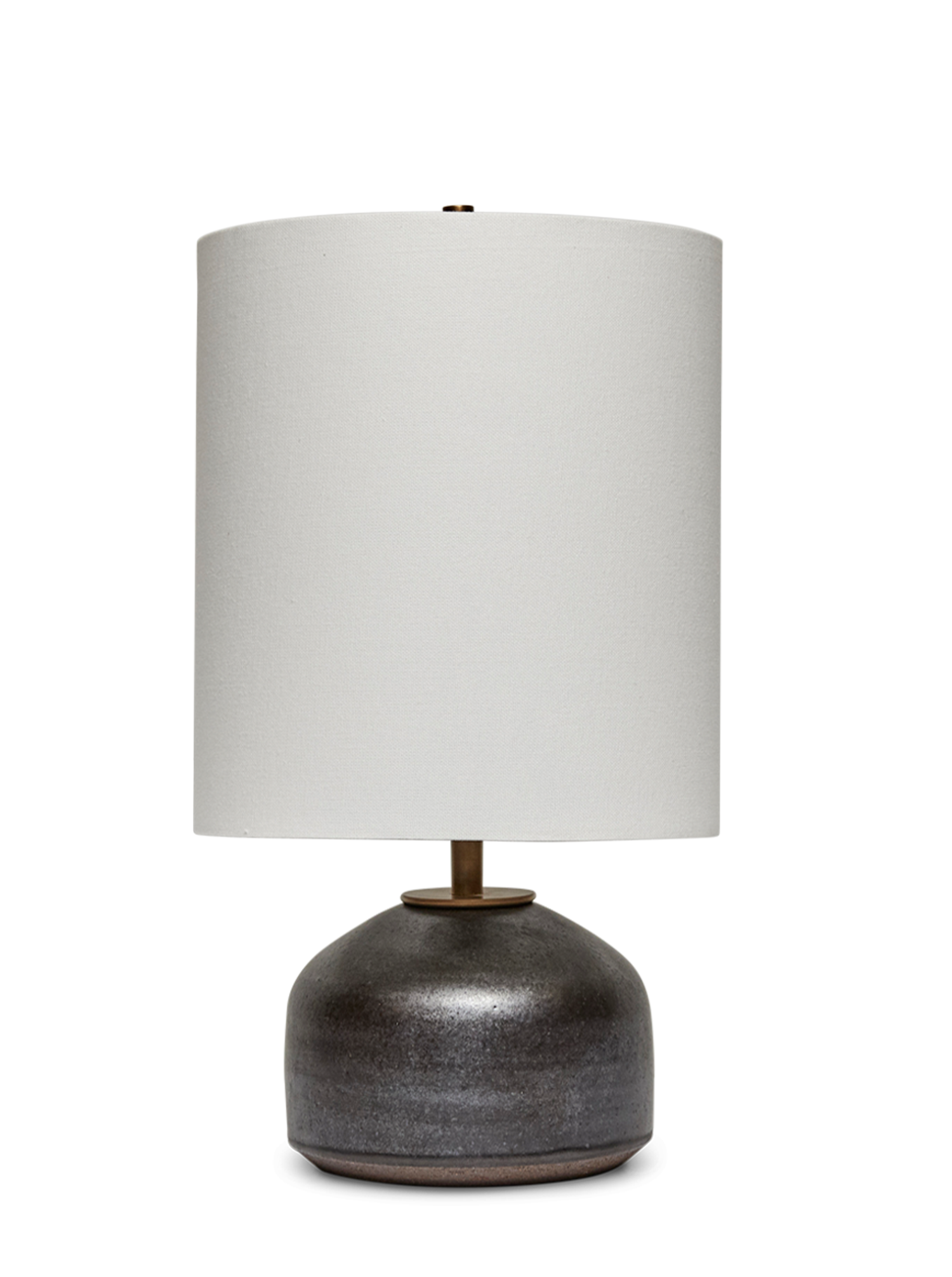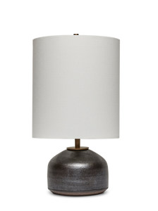 The Small Agnes Lamp has a short, wide base and a rounded top. This stoneware lamp is handmade in California and is completed with an oatmeal linen shade, diffuser top and twisted brown cloth cord (power switch on cord and lamp stem). Given the nature of handmade pottery, the size, finish, and shape may vary slightly.