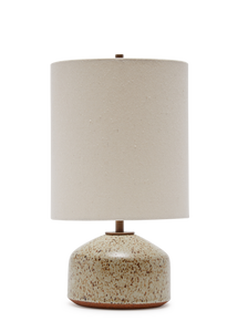 The Small Agnes Lamp has a short, wide base and a rounded top. This stoneware lamp is handmade in California and is completed with an oatmeal linen shade, diffuser top and twisted brown cloth cord (power switch on cord and lamp stem). Given the nature of handmade pottery, the size, finish, and shape may vary slightly. This product is made to order. Approximately 10 - 12 weeks. Lead time subject to change