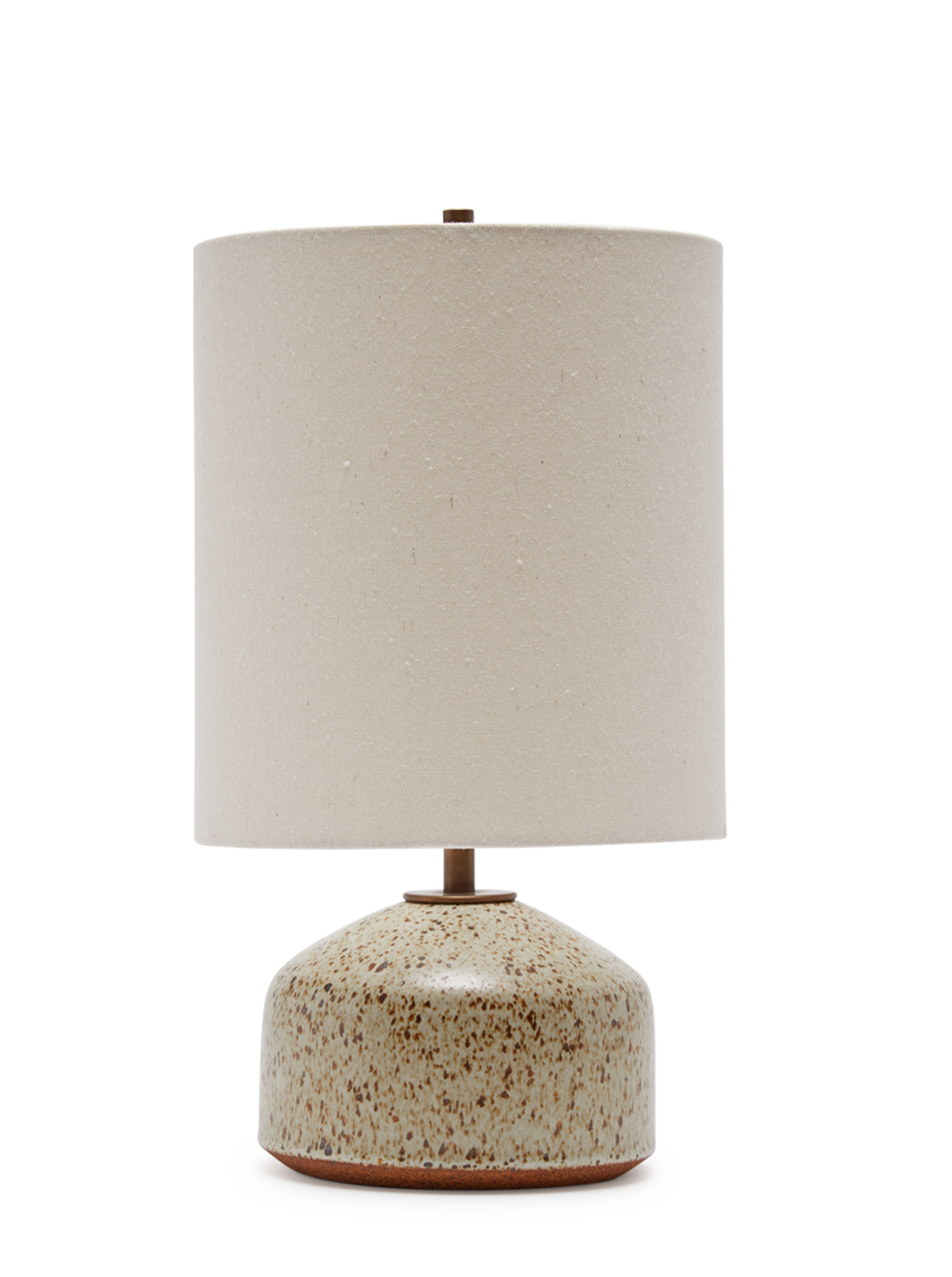 The Small Agnes Lamp has a short, wide base and a rounded top. This stoneware lamp is handmade in California and is completed with an oatmeal linen shade, diffuser top and twisted brown cloth cord (power switch on cord and lamp stem). Given the nature of handmade pottery, the size, finish, and shape may vary slightly.