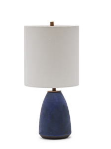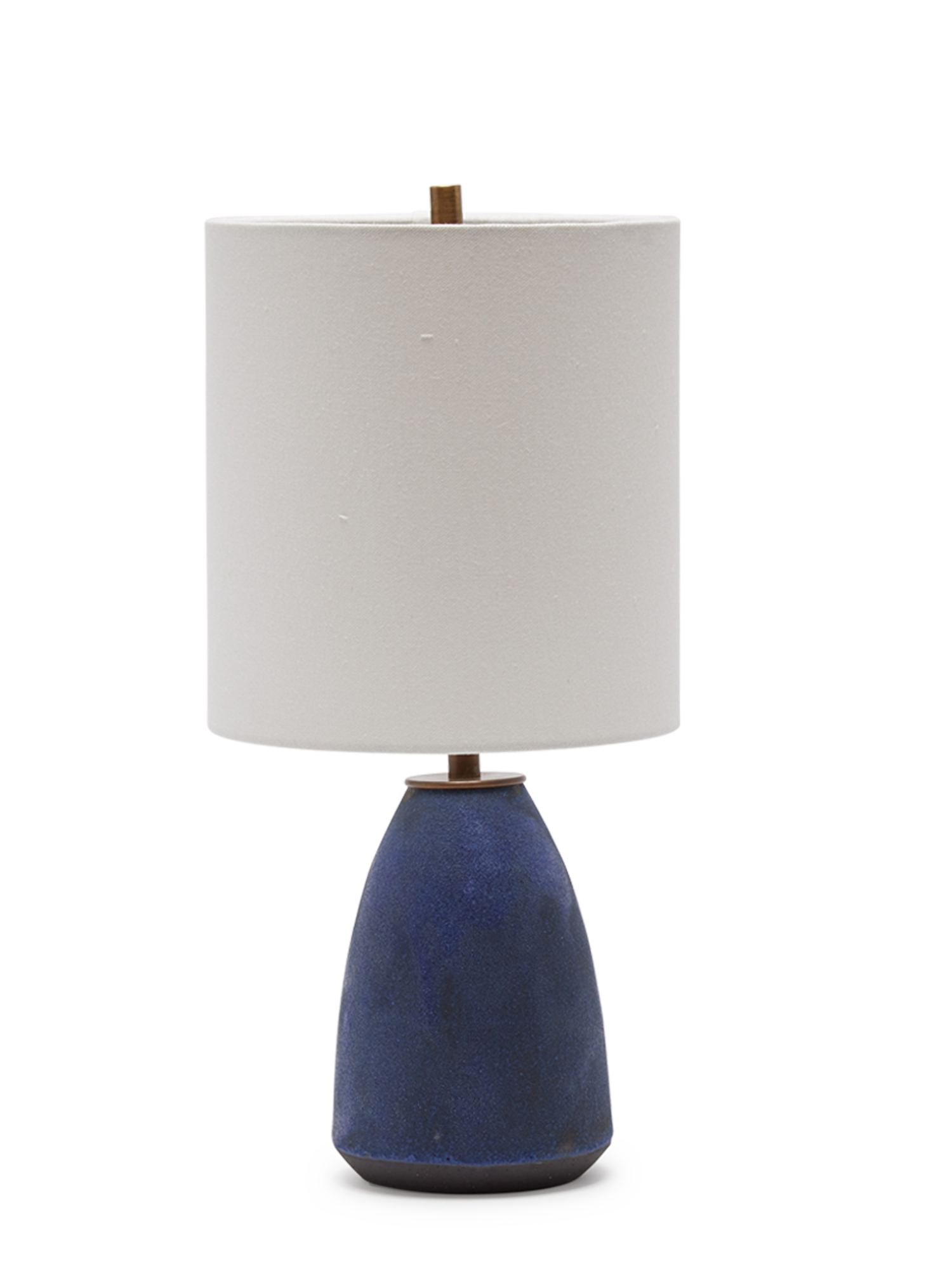 Form meets function with this petit accent lamp. Conically shaped, this stoneware piece is complimented by its tall drum shade β a balance of silhouettes that creates a modern, clean finish. Handmade in California, with an oatmeal linen shade and twisted brown cloth cord. Offered in a subtly striking hand brushed cobalt blue glaze with charcoal undertones. Shape, size and finish may vary slightly with each edition due to the unpredictable nature of studio pottery.