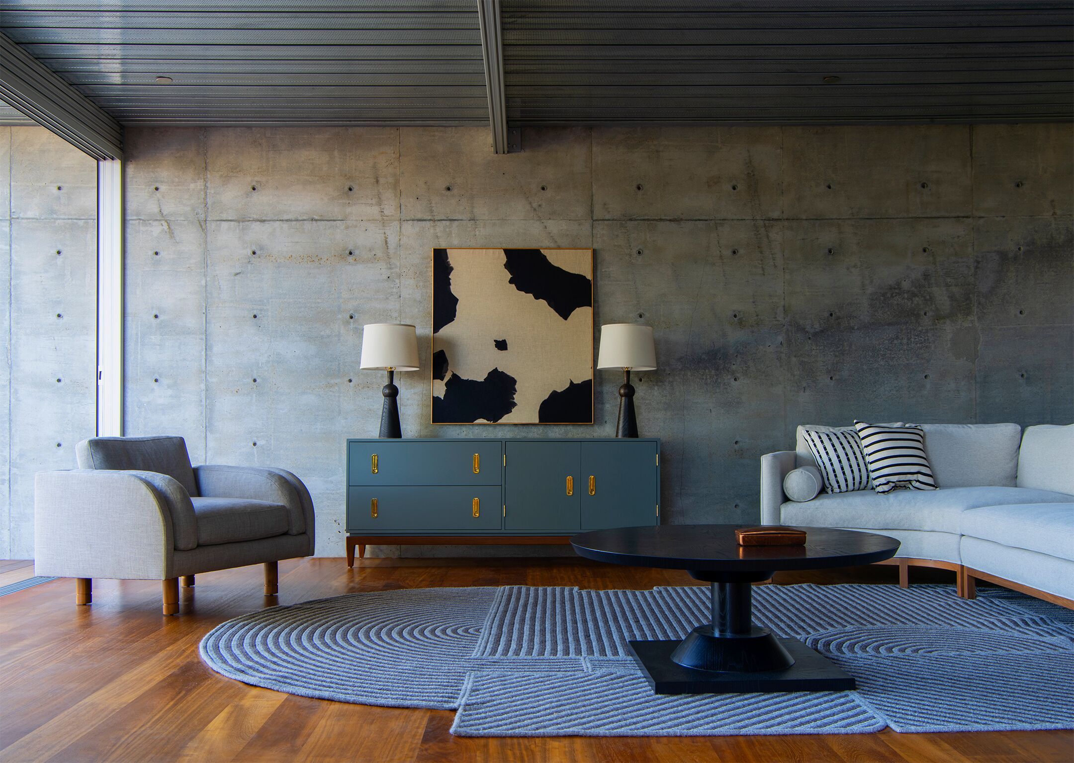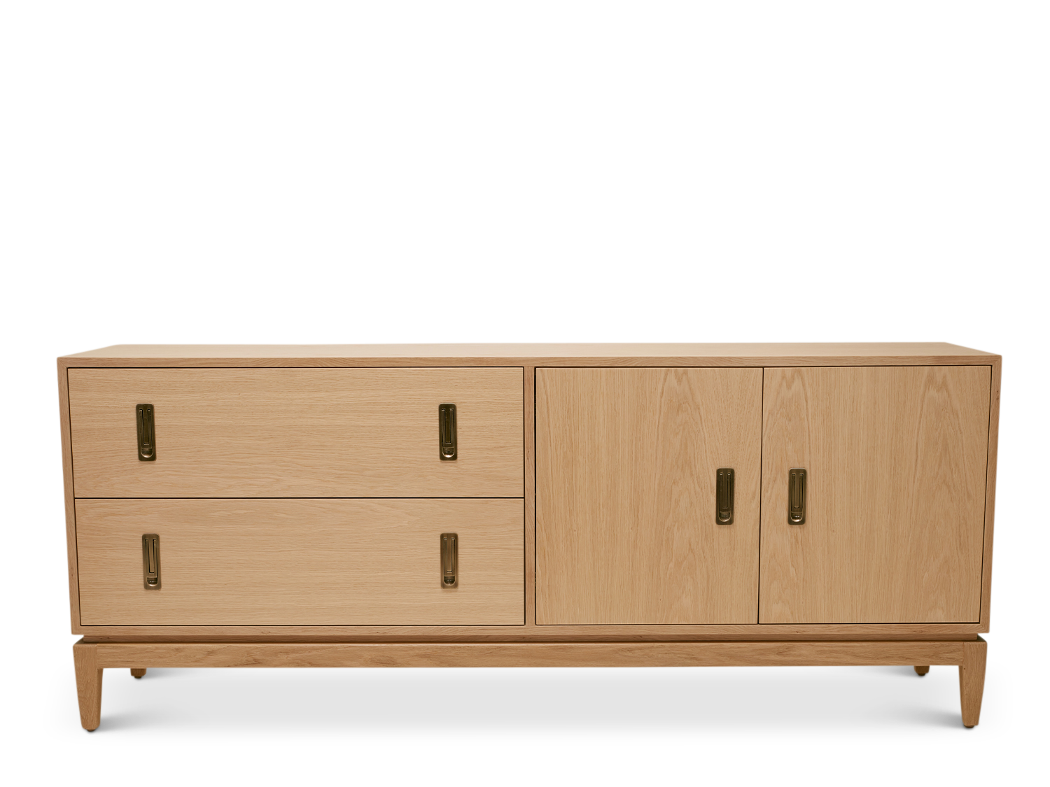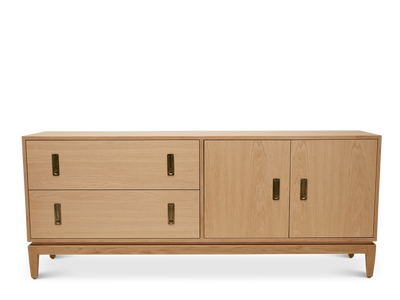 The Arcadia Cabinet features two drawers, two doors, hand crafted vintage style hardware and a sculptural solid American walnut or white oak base.
