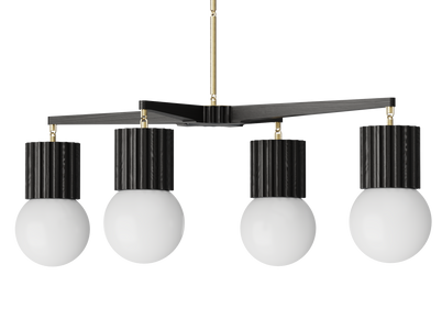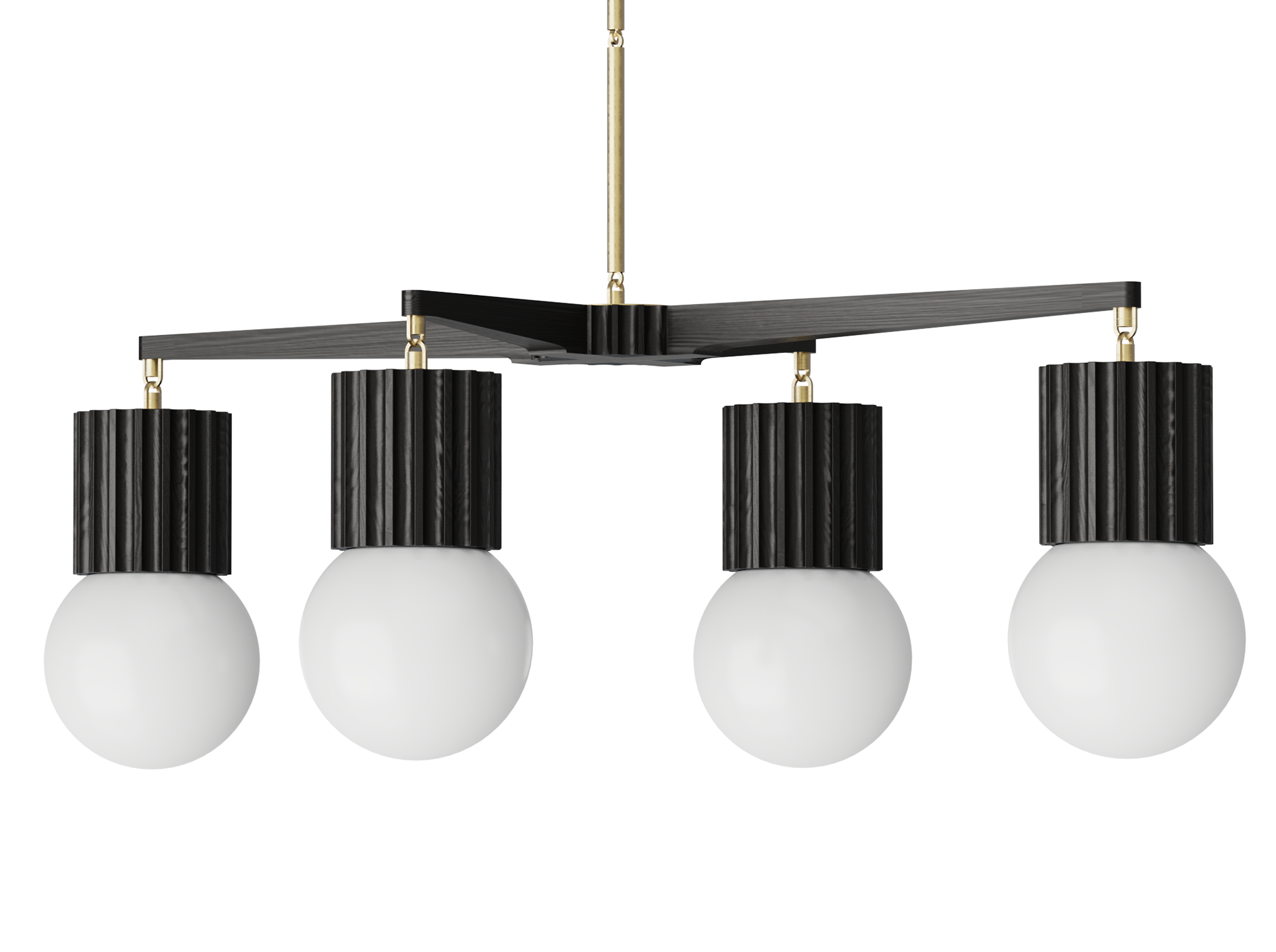 Inspired by the delicate, radiating petals of the R.I.-native Aster flower, the signature elegance of the Aster collection at a refined, dining-scale format. Four softly glowing globes, mounted to fluted wood turnings, suspended from a carefully detailed wood armature, introduce gentle texture and a sense of movement. Brass accents add a layer of refinement to a composition that is both architectural and botanical in nature.