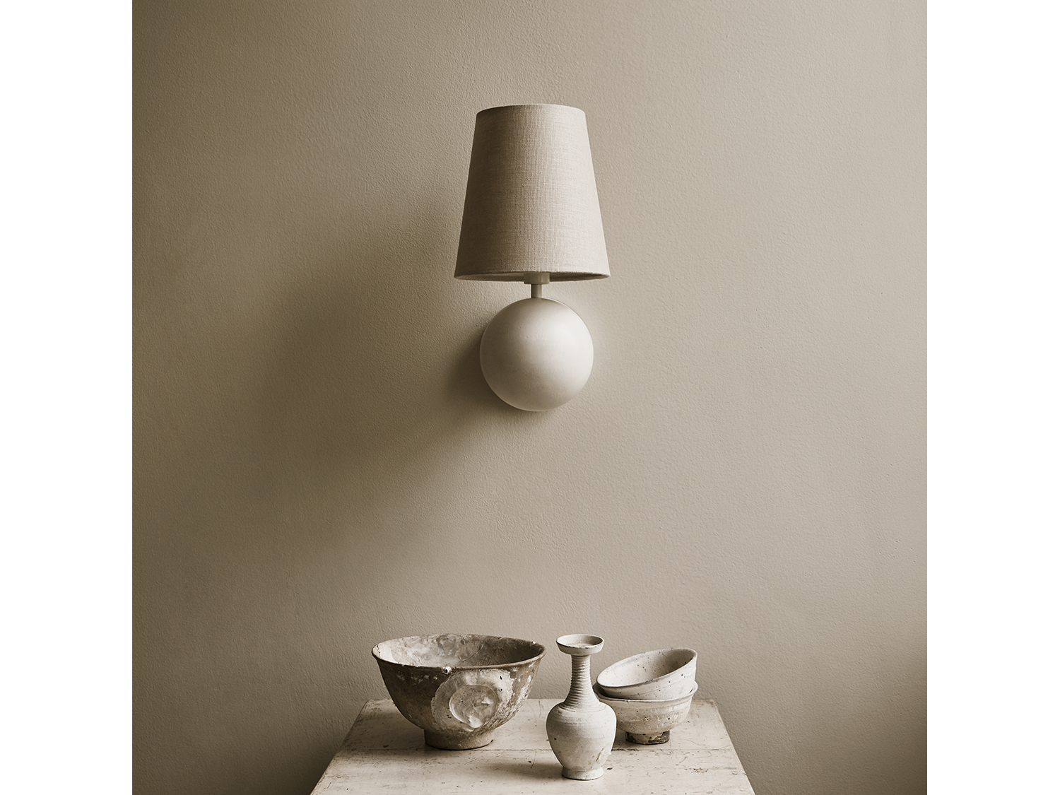 The Bole Sconce positions a rotund form beneath a fabric shade, presenting a grounded yet buoyant composition for the wall.