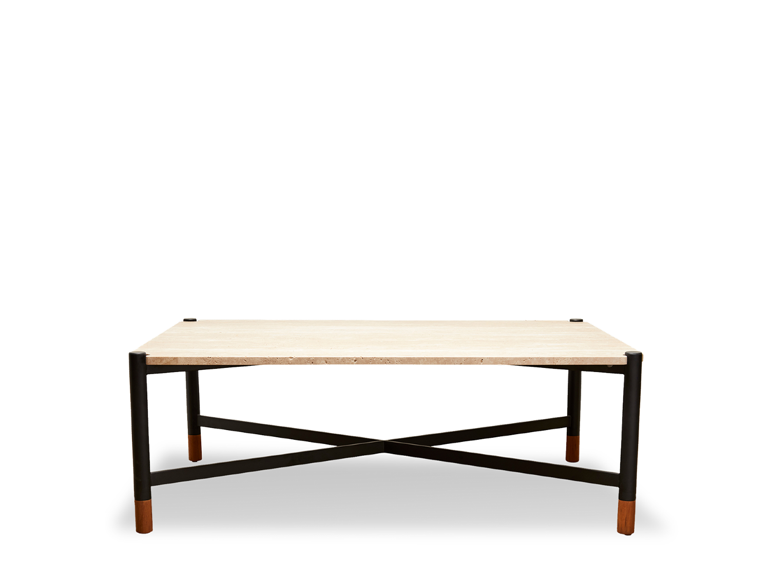 The outdoor Bronson Coffee Table features a stone top with notched corners that rests atop a powder coated steel base with teak feet. Suitable for indoor and outdoor use.