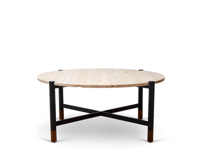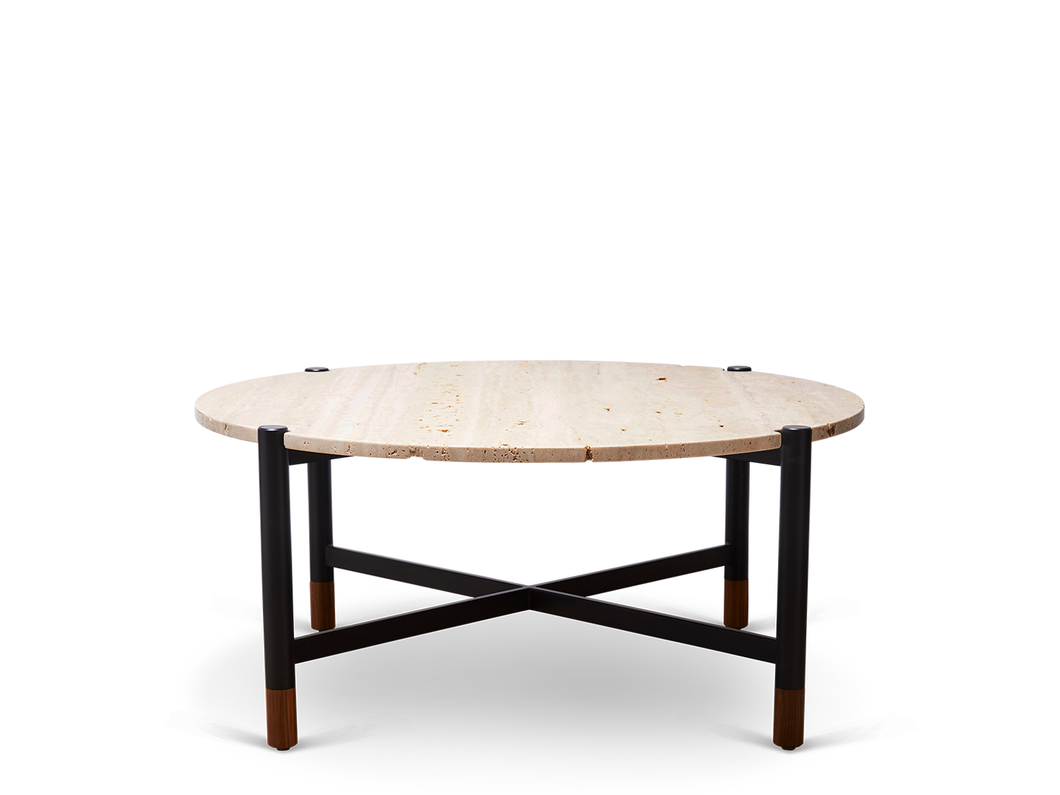 The outdoor Bronson Coffee Table features a stone top with notched corners that rests atop a powder coated steel base with teak feet. Suitable for indoor and outdoor use.