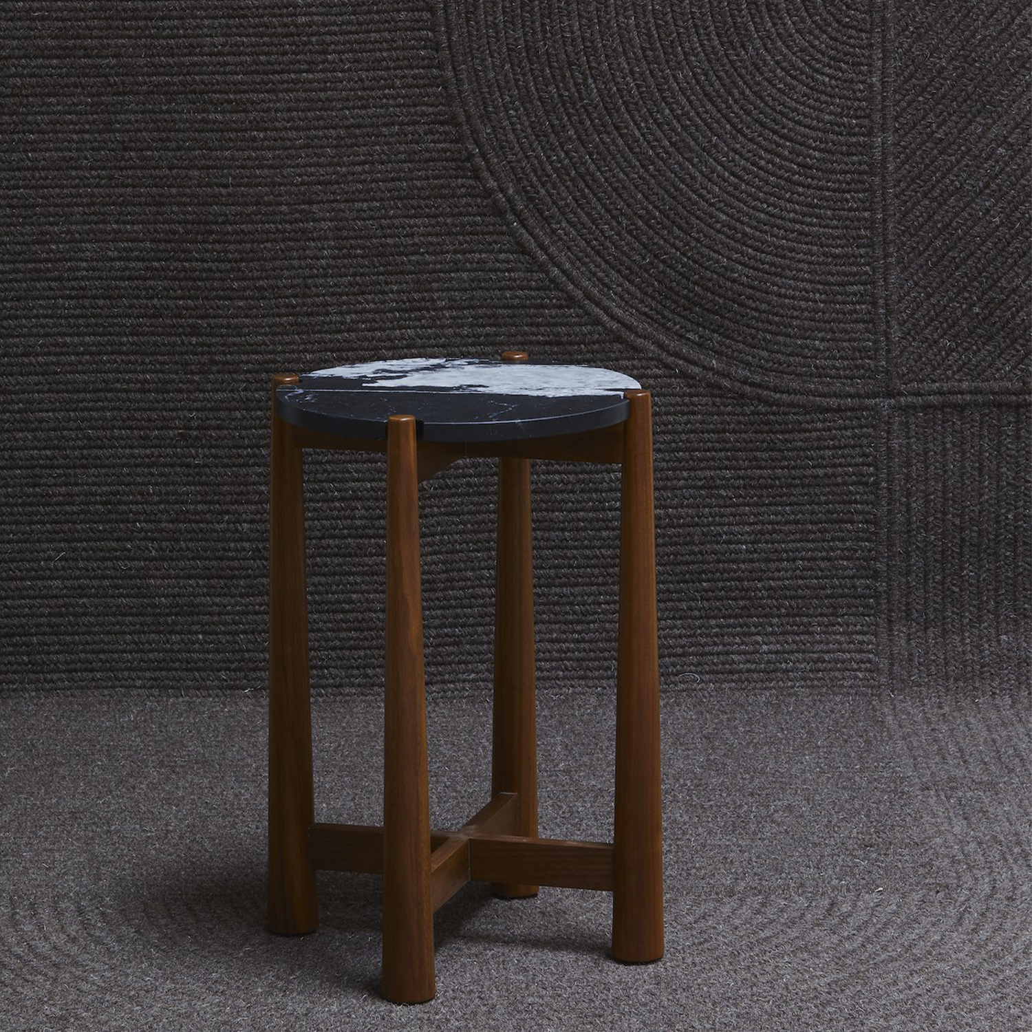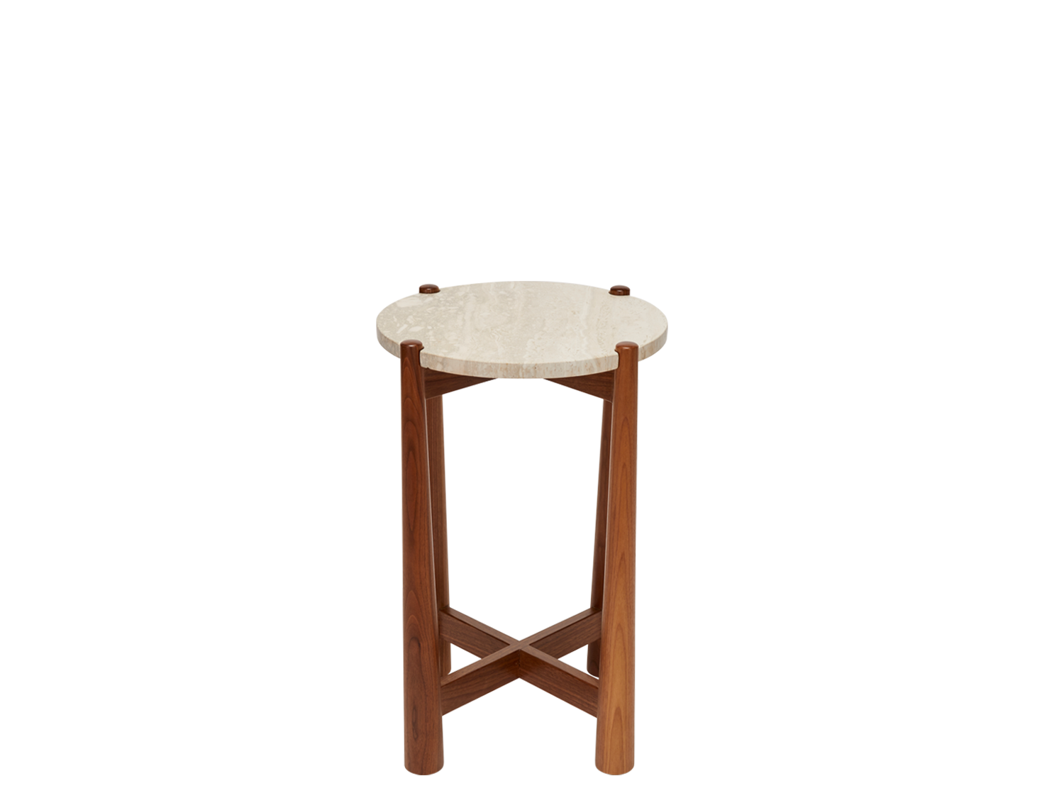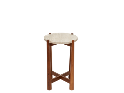 The Bronson Drinks Table features a round stone top with notched corners that rest atop a detailed walnut or oak base.