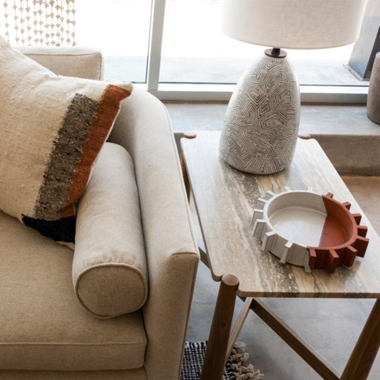 The Bronson Side Table features a stone top with notched corners that rests atop a detailed American walnut or white oak base.
