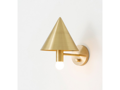 The Canopy Sconce deconstructs the conventional wall sconce into a series of expressed, geometric relationships. A bold conical shroud rises above a softly glowing bulb creating a canopy of diffused reflection.