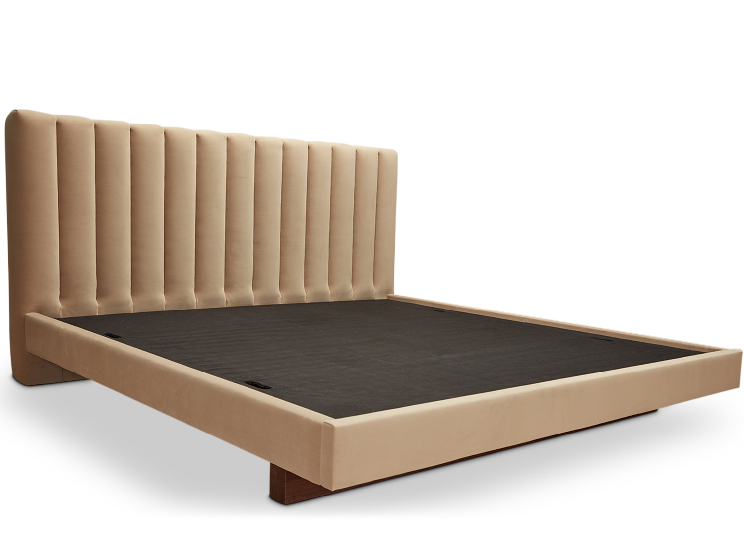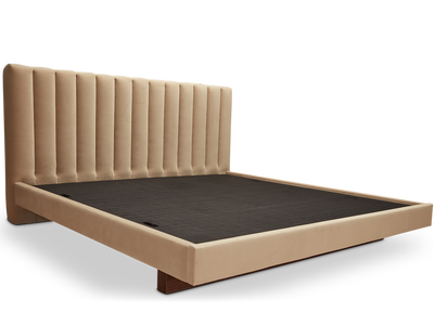 The Capitan Bed features a channel tufted headboard, fully upholstered side rails, and a minimal Japanese-inspired platform.