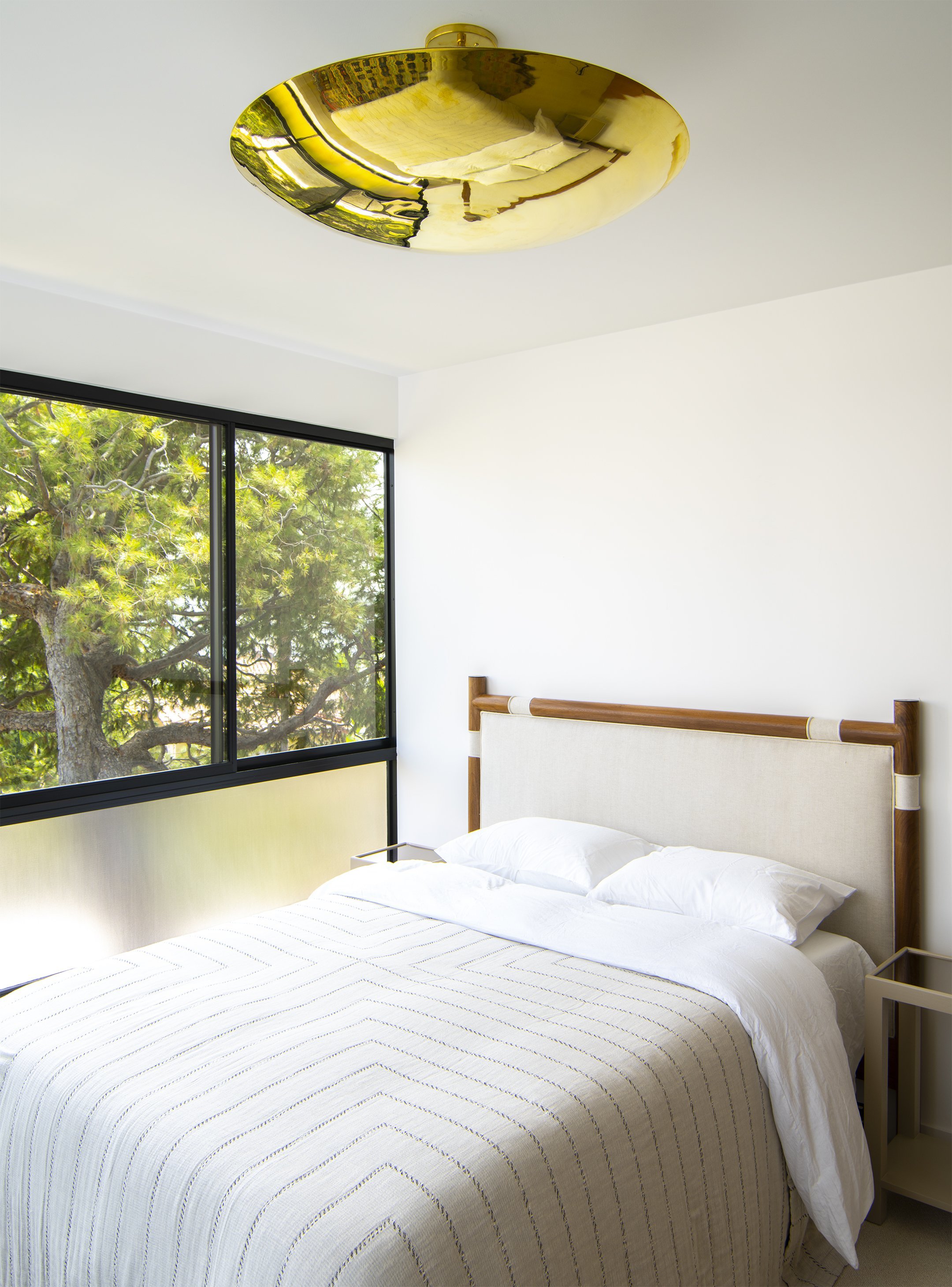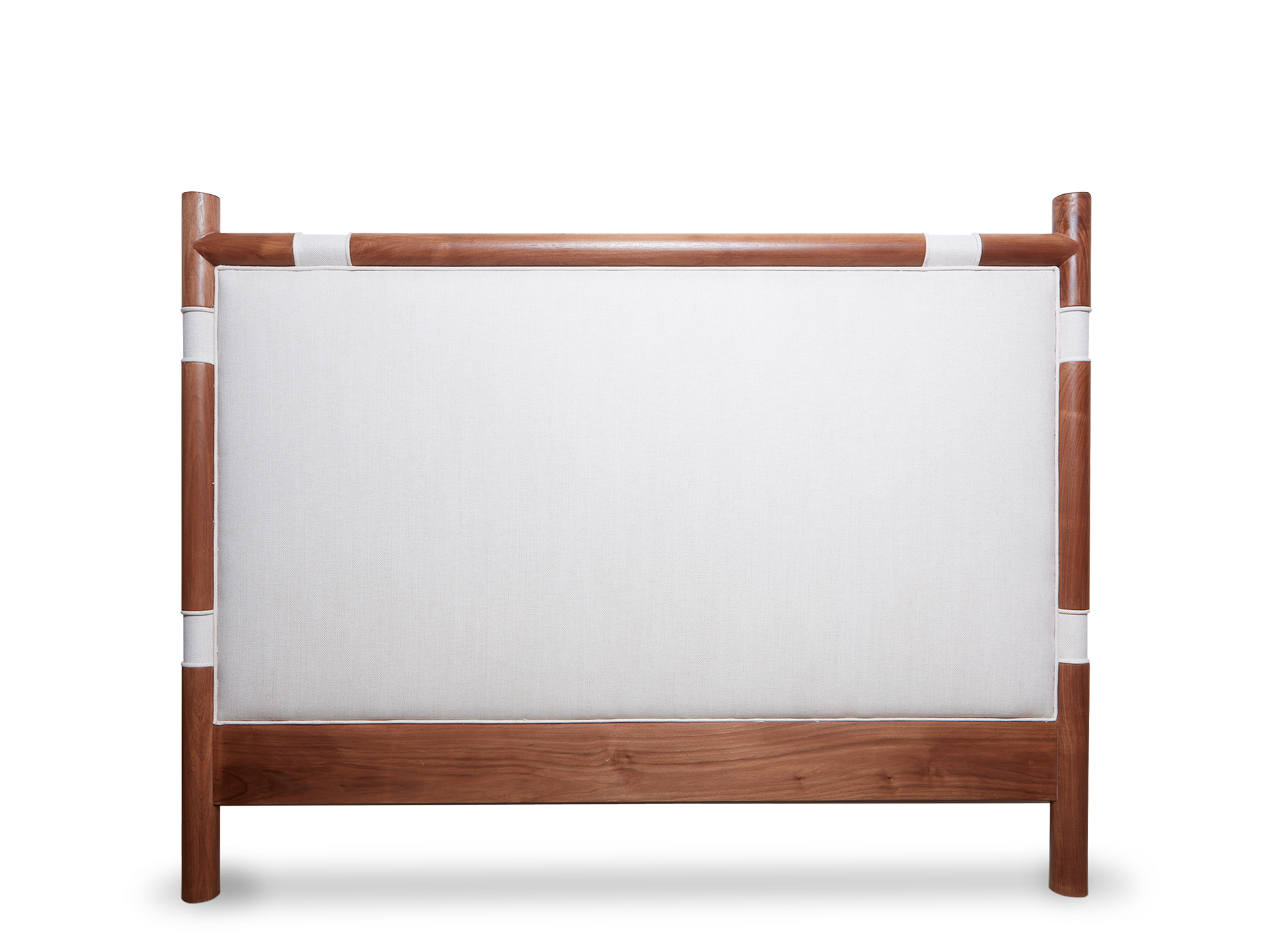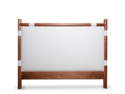 The Chiselhurst headboard features a solid American walnut or white oak frame finished with brass caps and an upholstered headboard.