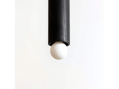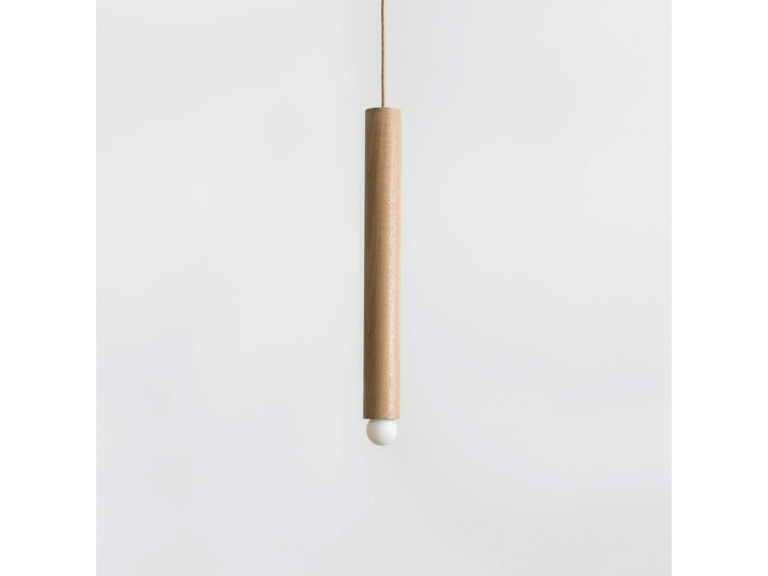 The Lodge Cord Pendant is crafted from a hand-turned oak dowel in our linear length. Suspended from a cloth cord, the wooden dowel is a tactile armature punctuated by a single glowing bulb.