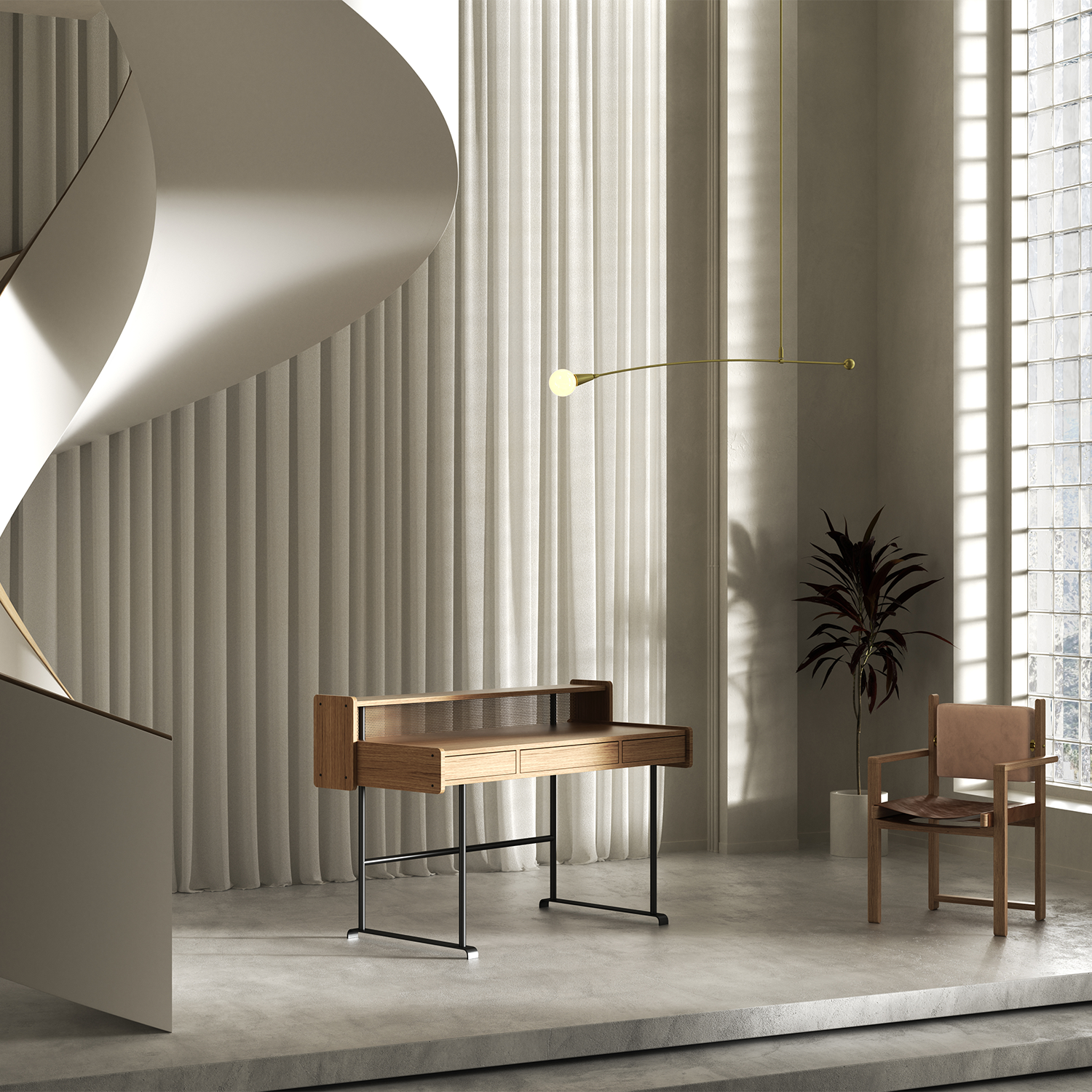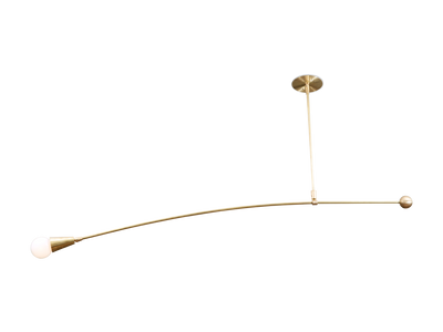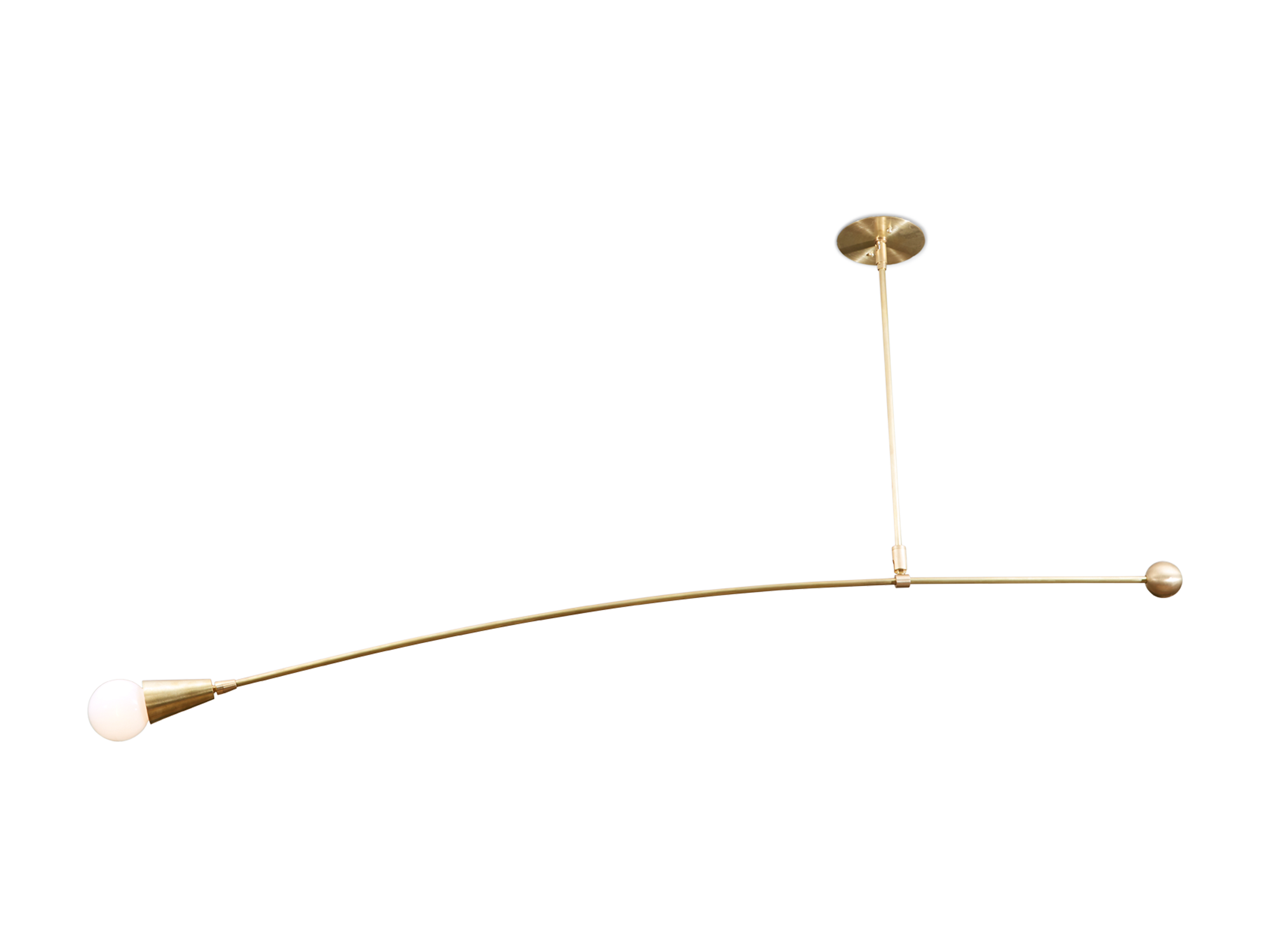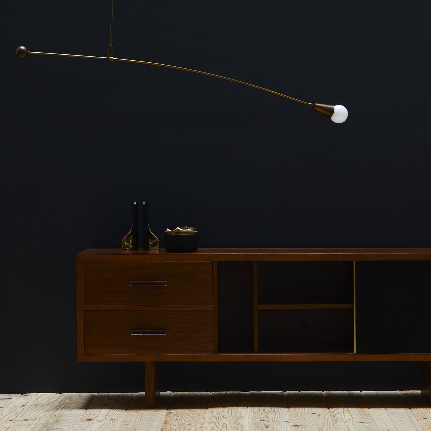The Counterbalance Chandelier features a brass rod that is delicately balanced with a brass finial on one end and a large bulb on the other. The chandelier is available in brass or powdercoated metal finishes.