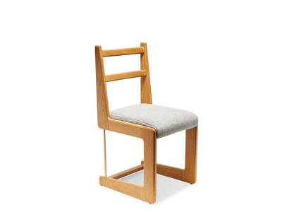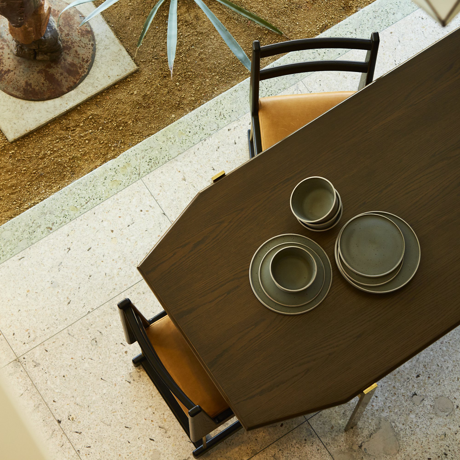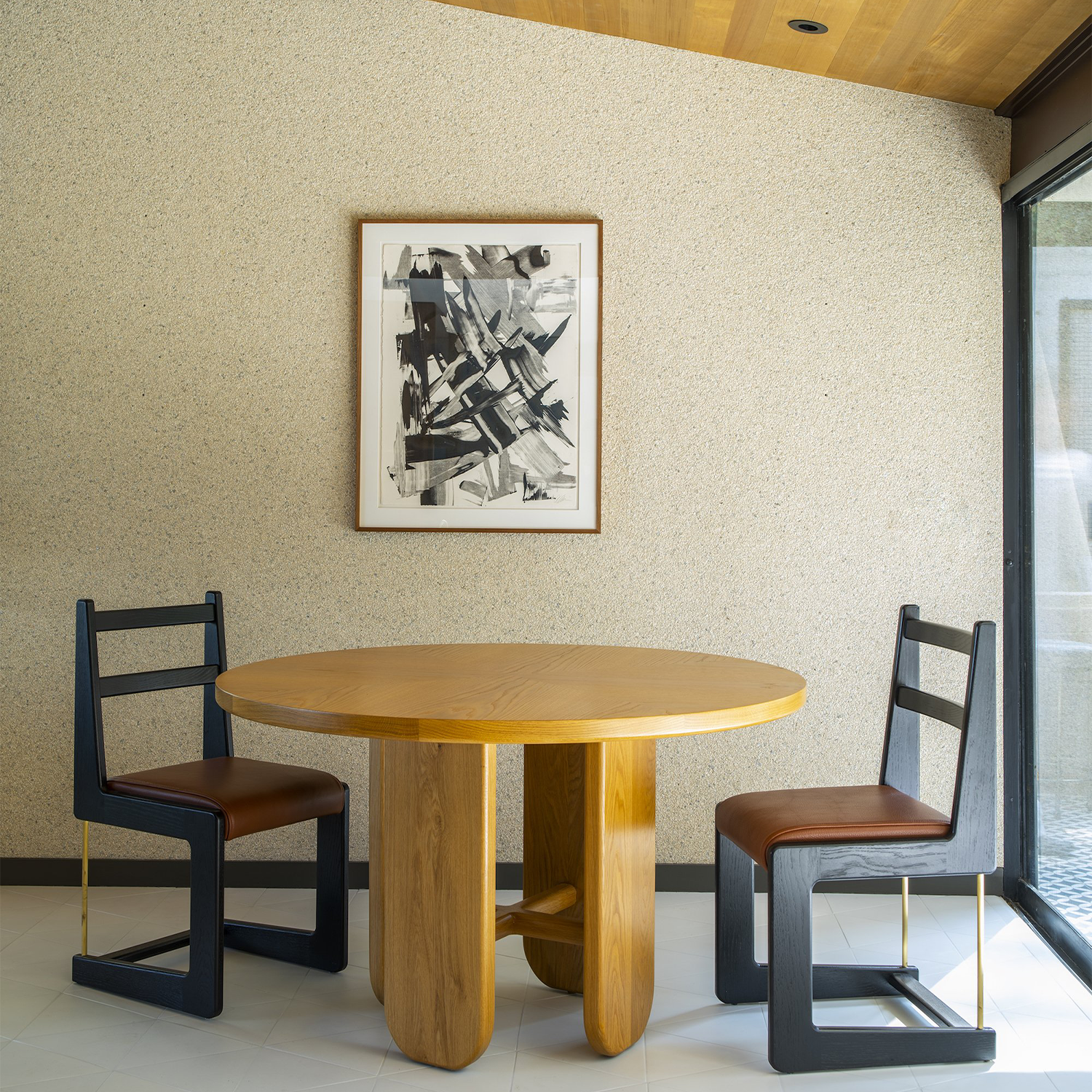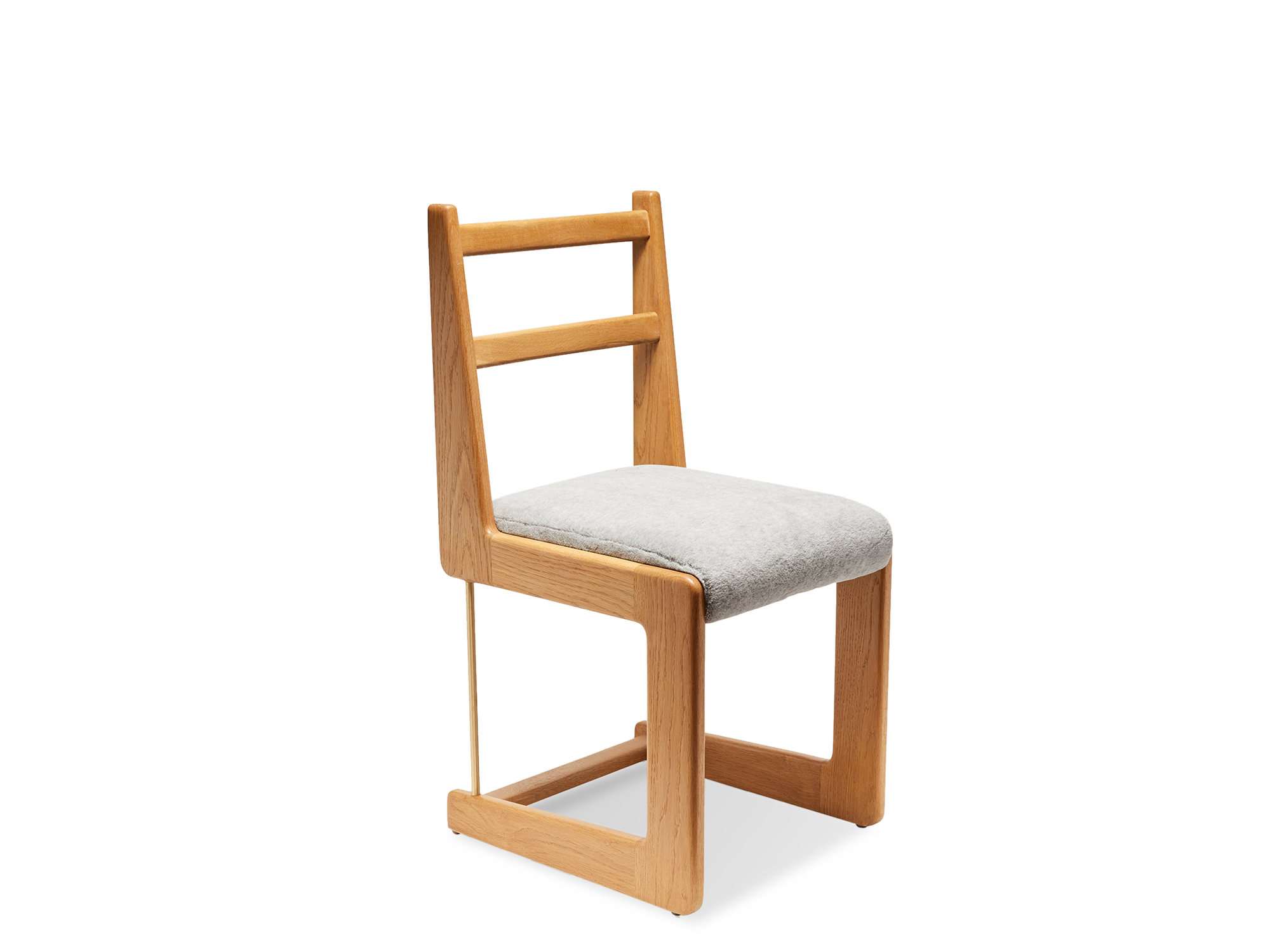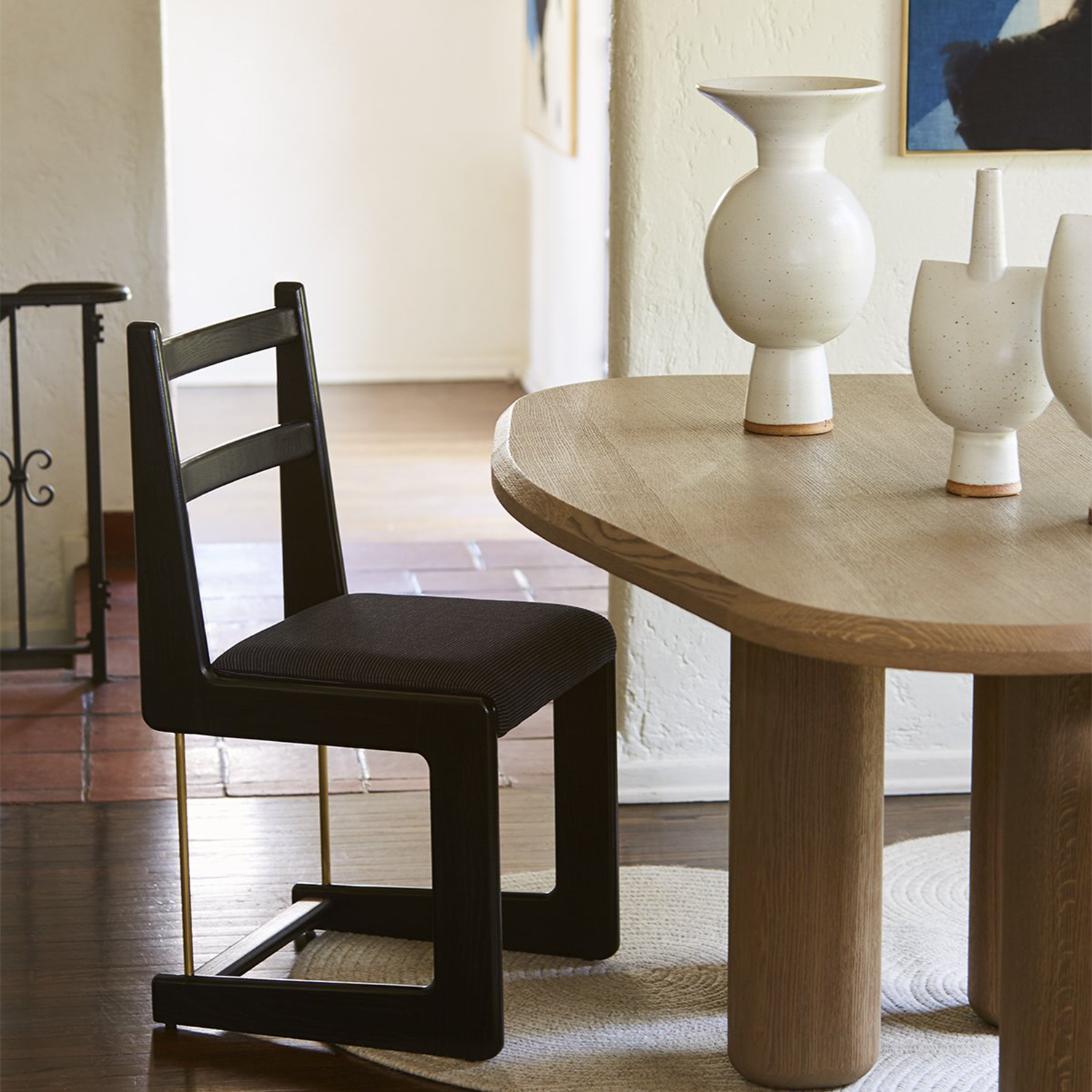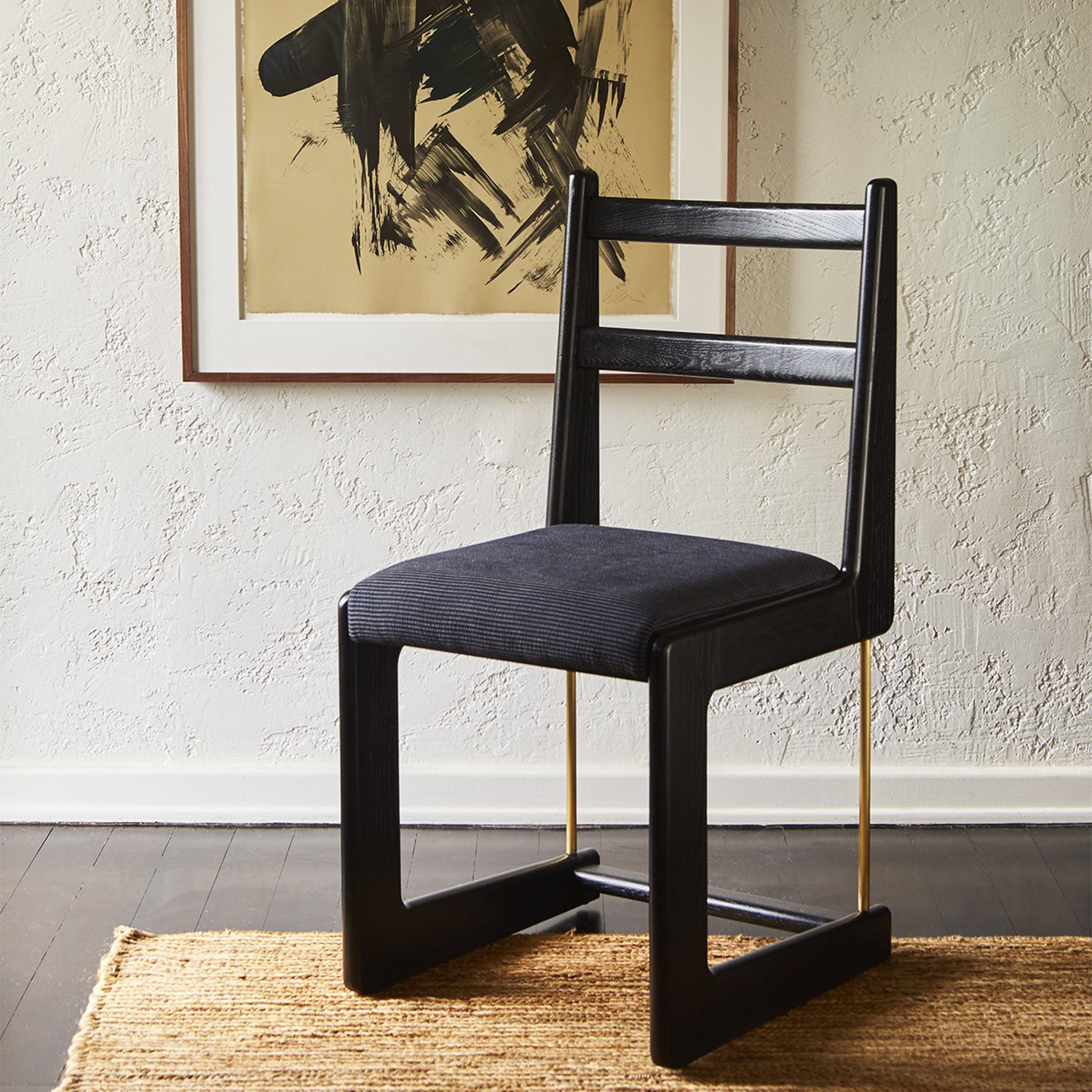 The Cruz Dining Chair is made from solid American walnut or white oak frame that features a cantilevered shape, lacquered brass stretchers and an upholstered seat. Inspired by the bold scale and linear detailing of early 20th Century California designers.