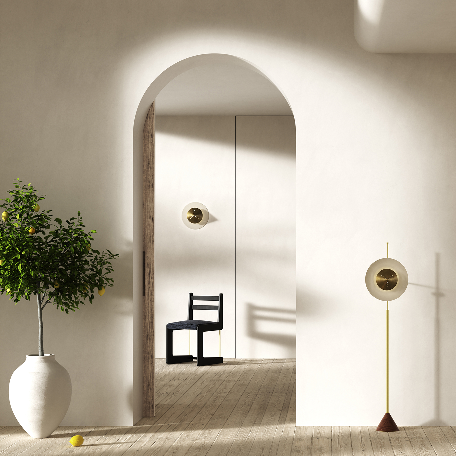 The Cruz Dining Chair is made from solid American walnut or white oak frame that features a cantilevered shape, lacquered brass stretchers and an upholstered seat.
