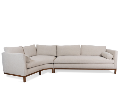 The Curved Back Sectional is a tuxedo style sofa with curved back corners and features down-wrapped, removable seat and back cushions and two bolsters. Can be made with a White Oak or American Walnut. Also available as a sofa.