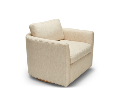 The Curved Back Swivel Chair is a tuxedo style lounge chair with curved corners and a swivel base. The chair features down-wrapped, removable seat and back cushions, and a self welt along the outer edge of the frame.