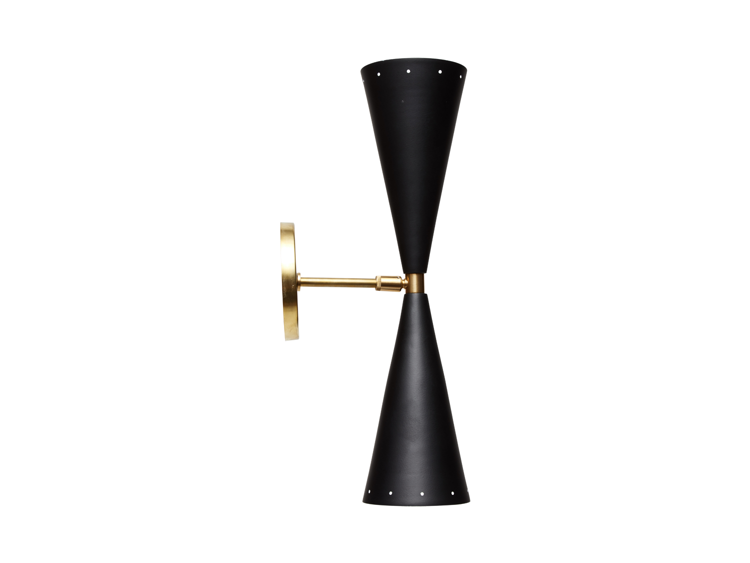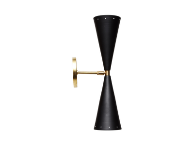 The Double Cone Sconce features two tapered cones, in either black or white, with small perforations at both ends with a brass backplate and spacer.