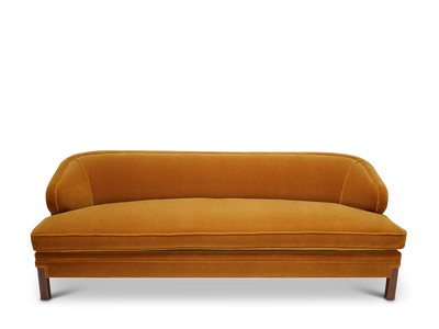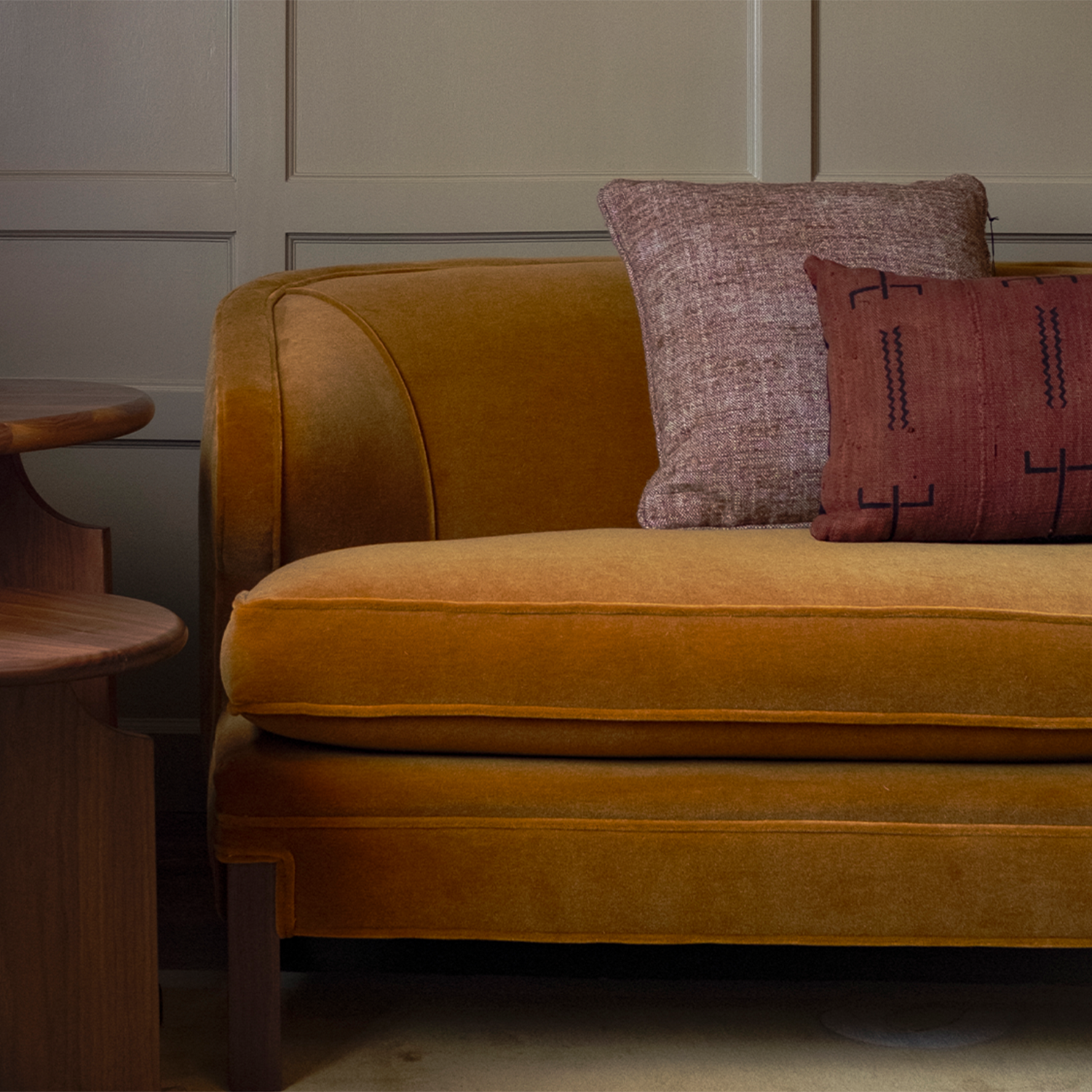 The Douglas Sofa is a low slung sofa with a down-wrapped seat cushion and solid American walnut or white oak legs.
