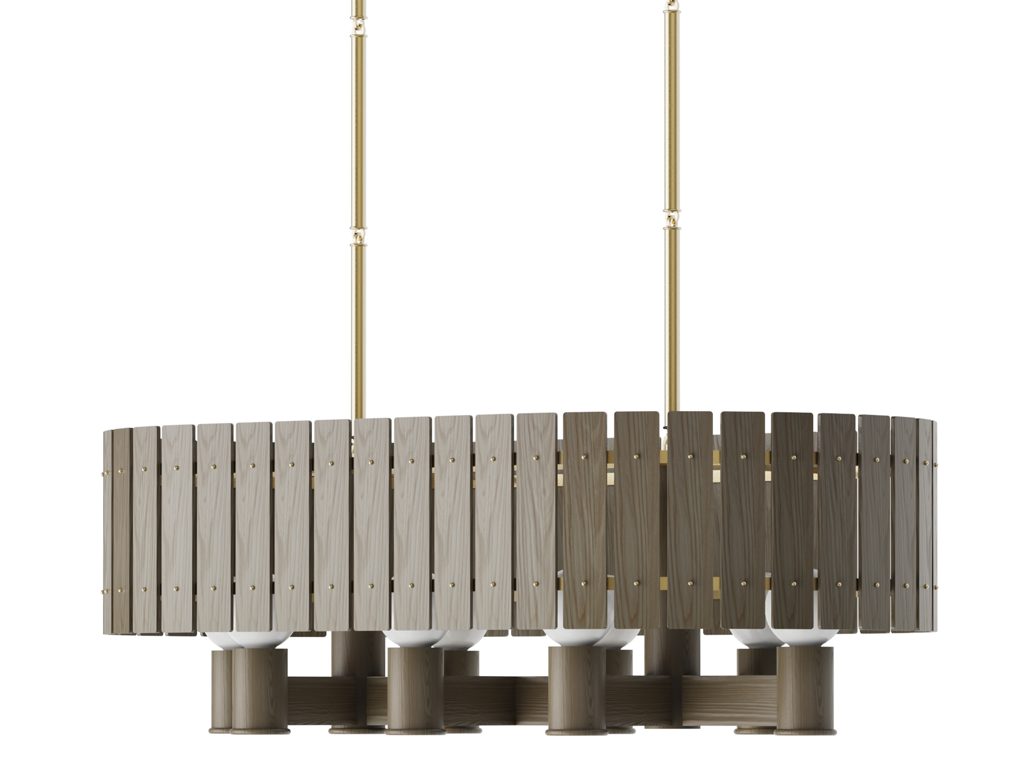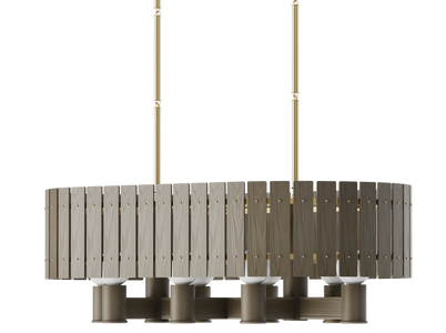 The Dusk Chandelier channels that magic moment when the sun sets and the day gives way to night. The suns setting rays cut across the horizon, creating a magical moment of dark shadows and blazing light. Carefully hand crafted in wood and brass, Dusk features beautiful wood turnings, a fine slatted shade and a unique segmented brass hang chain.