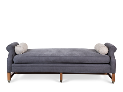 The Dutch Daybed has a semi-attached cushion with two bolster pillows. The base is made of American walnut or white oak and antique brass toecaps. Available with one or two arms.