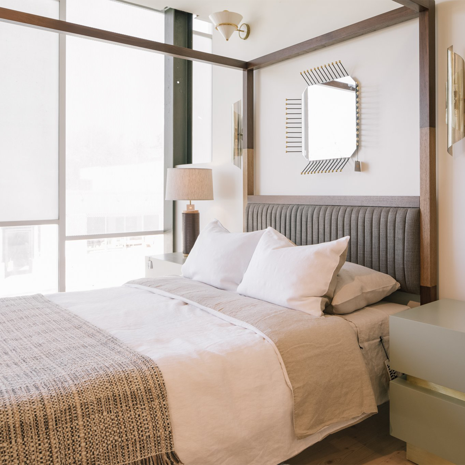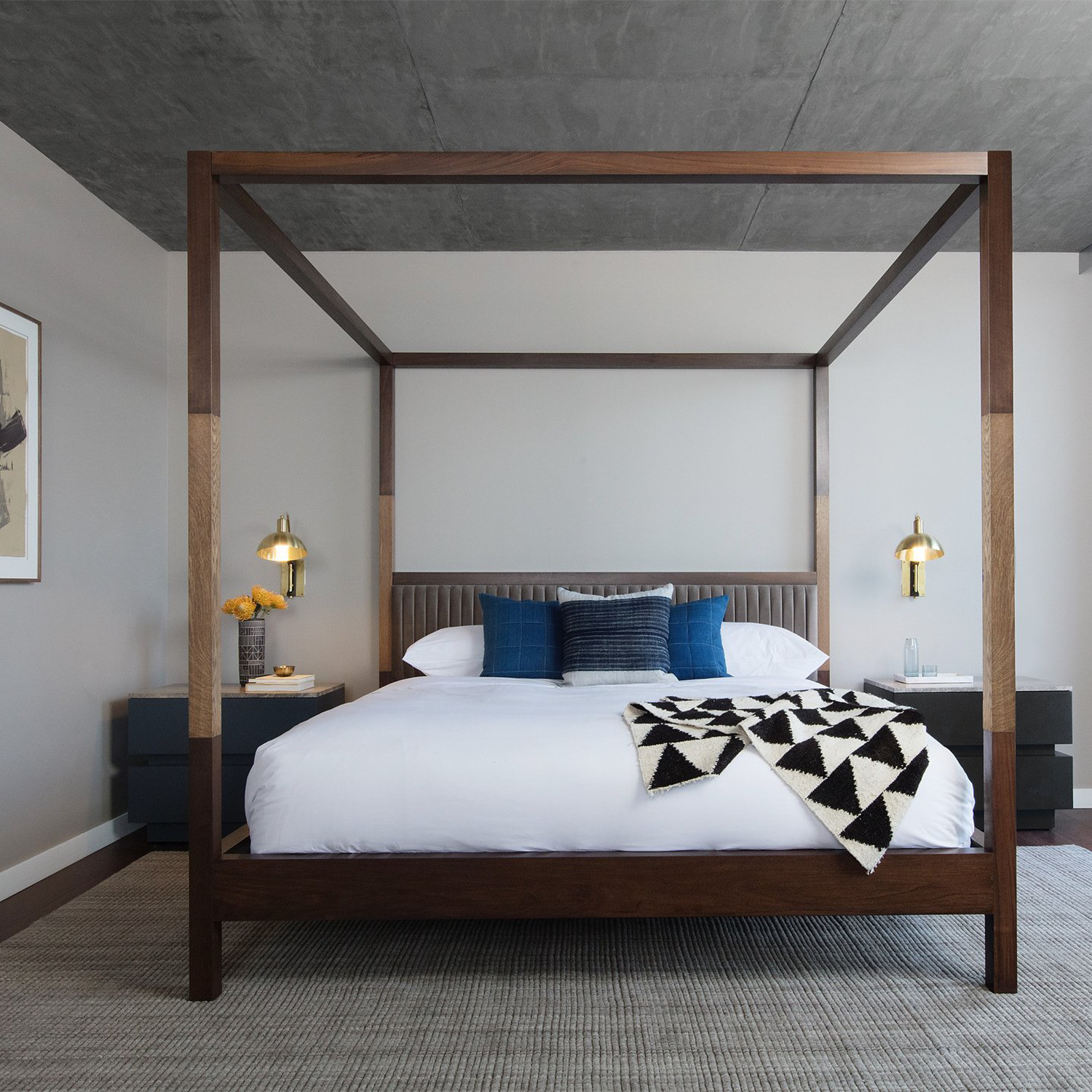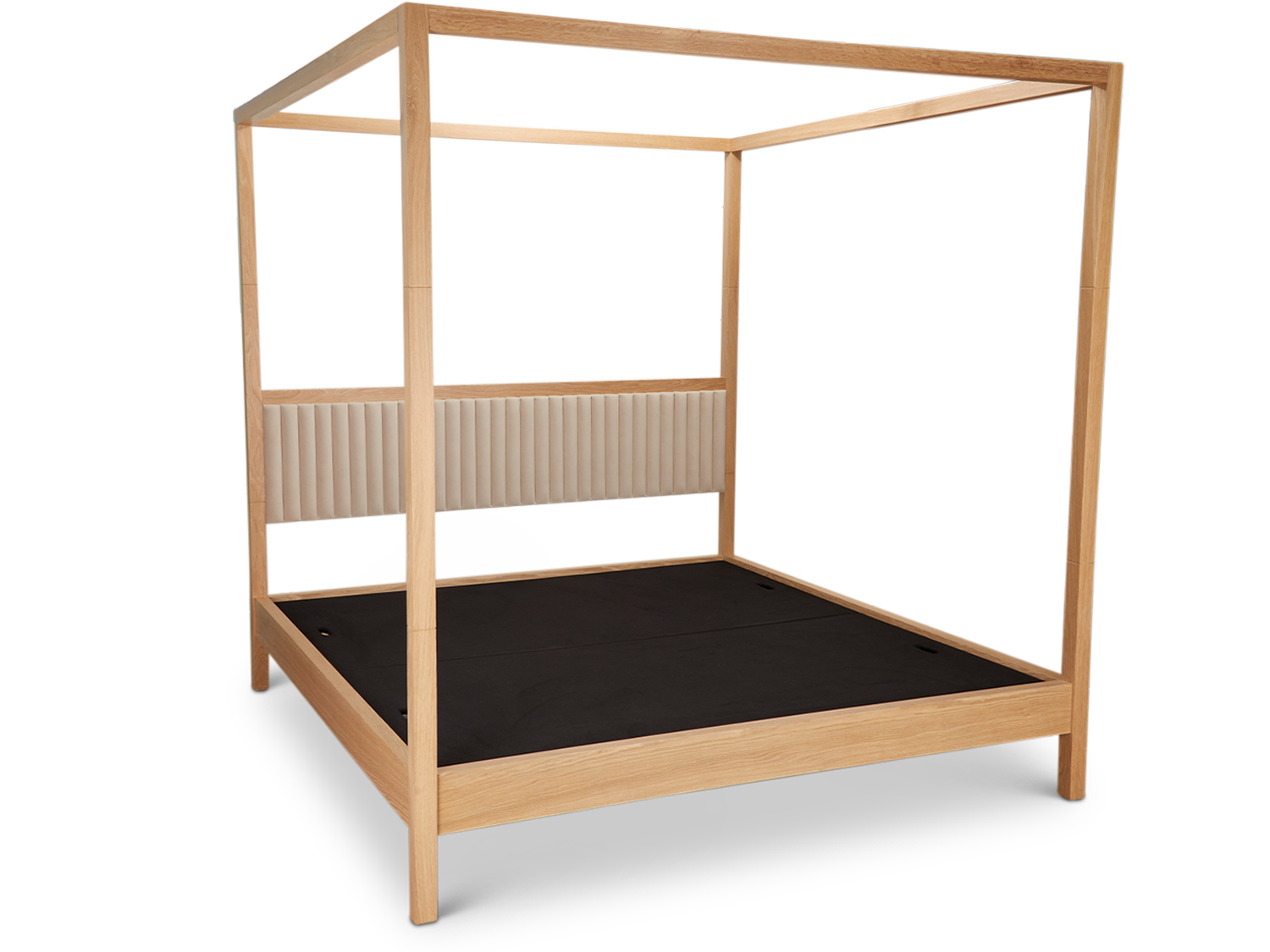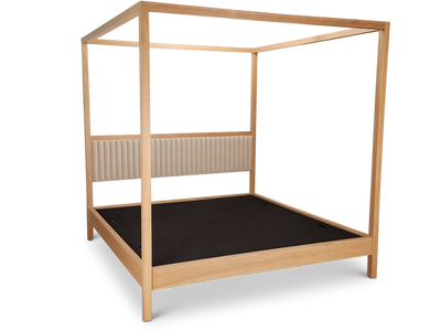 The Edmund Bed is a wooden canopy bed with a combination of American walnut and white oak. The headboard features channel tufted upholstery.