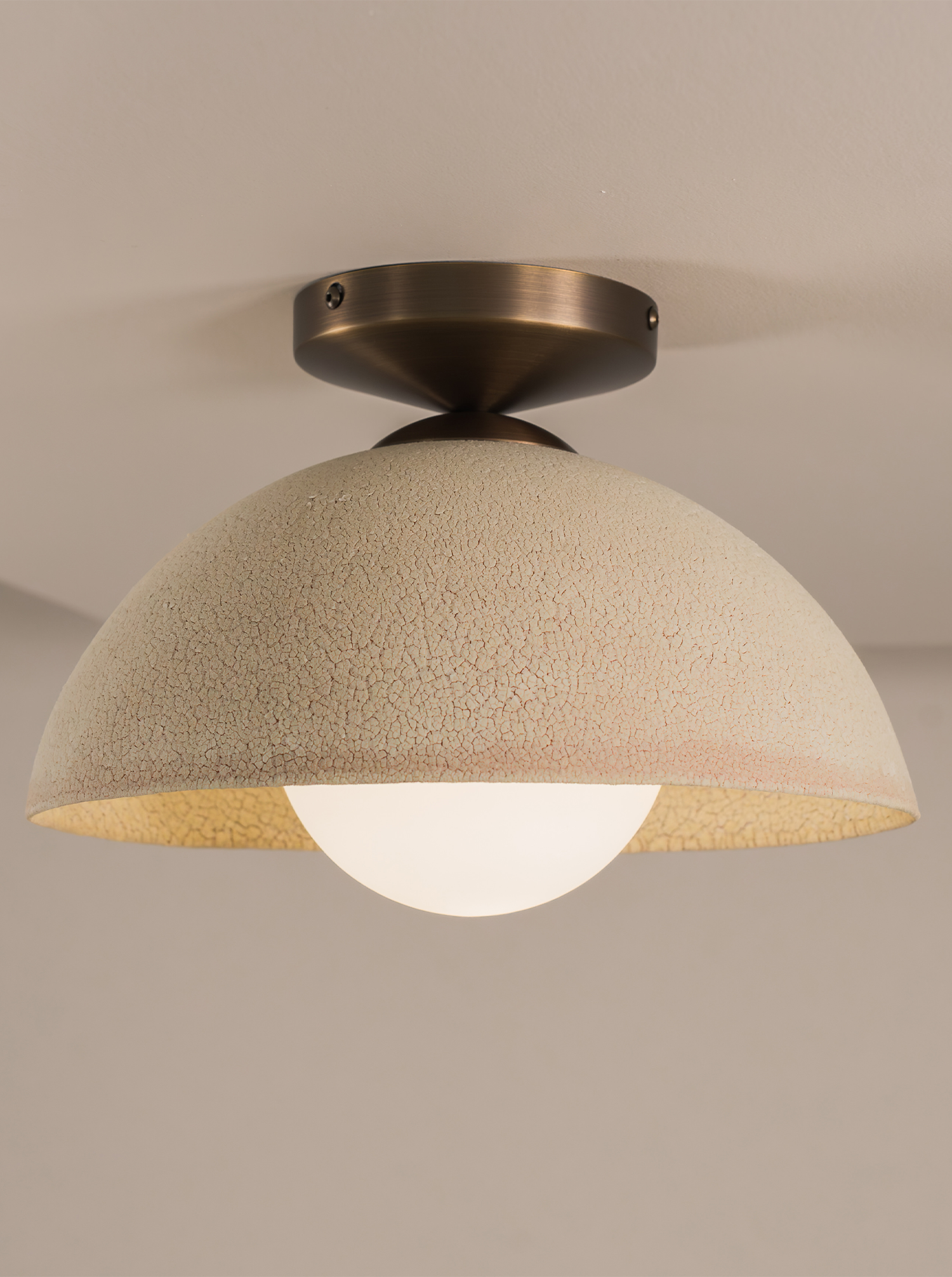 As part of the Emmet family of fixtures, this flush mount showcases minimal lines, great proportions and celebrates the warmth and beauty of glazed terracotta and handmade glass. Suitable for ceiling installs, the flush mount is made to your choice of finish.