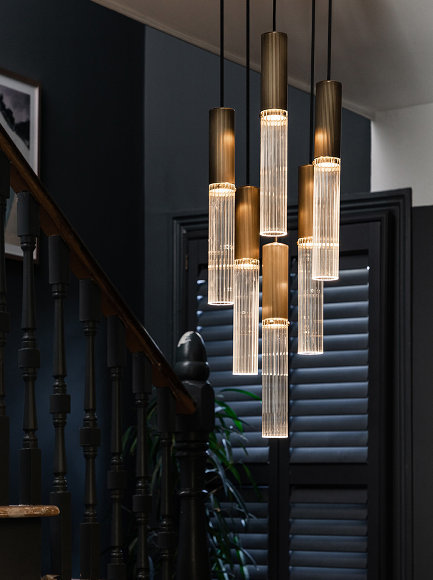 A dynamic six-drop arrangement of the Flume 50 Pendant, where contemporary design and precision engineering converge to create a truly unique lighting installation.