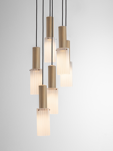 A dynamic six-drop arrangement of the Flume 80 Pendant, where contemporary design and precision engineering converge to create a truly unique lighting installation.