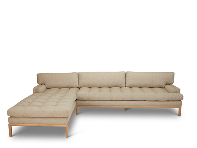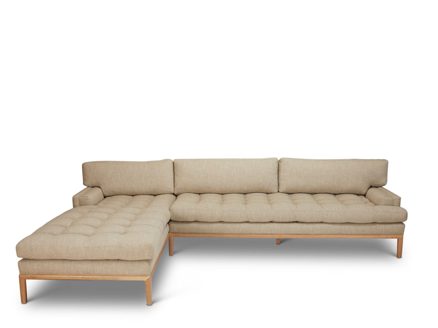 The finely tailored two piece Forster Sectional consists of a bench sofa and a generous chaise which can be specified to land on either side. This sectional rests atop an elegantly tapered solid wood base.