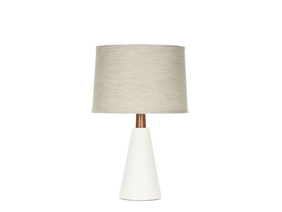 Handcrafted stoneware lamp made in upstate New York by Stone and Sawyer. Please contact showroom for custom glaze options. Images feature satin brass metal, walnut wood, and natural linen shade. Please review lead times and shipping notes in Product Details prior to purchasing.