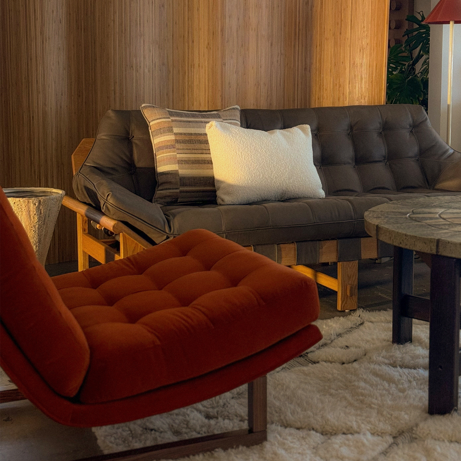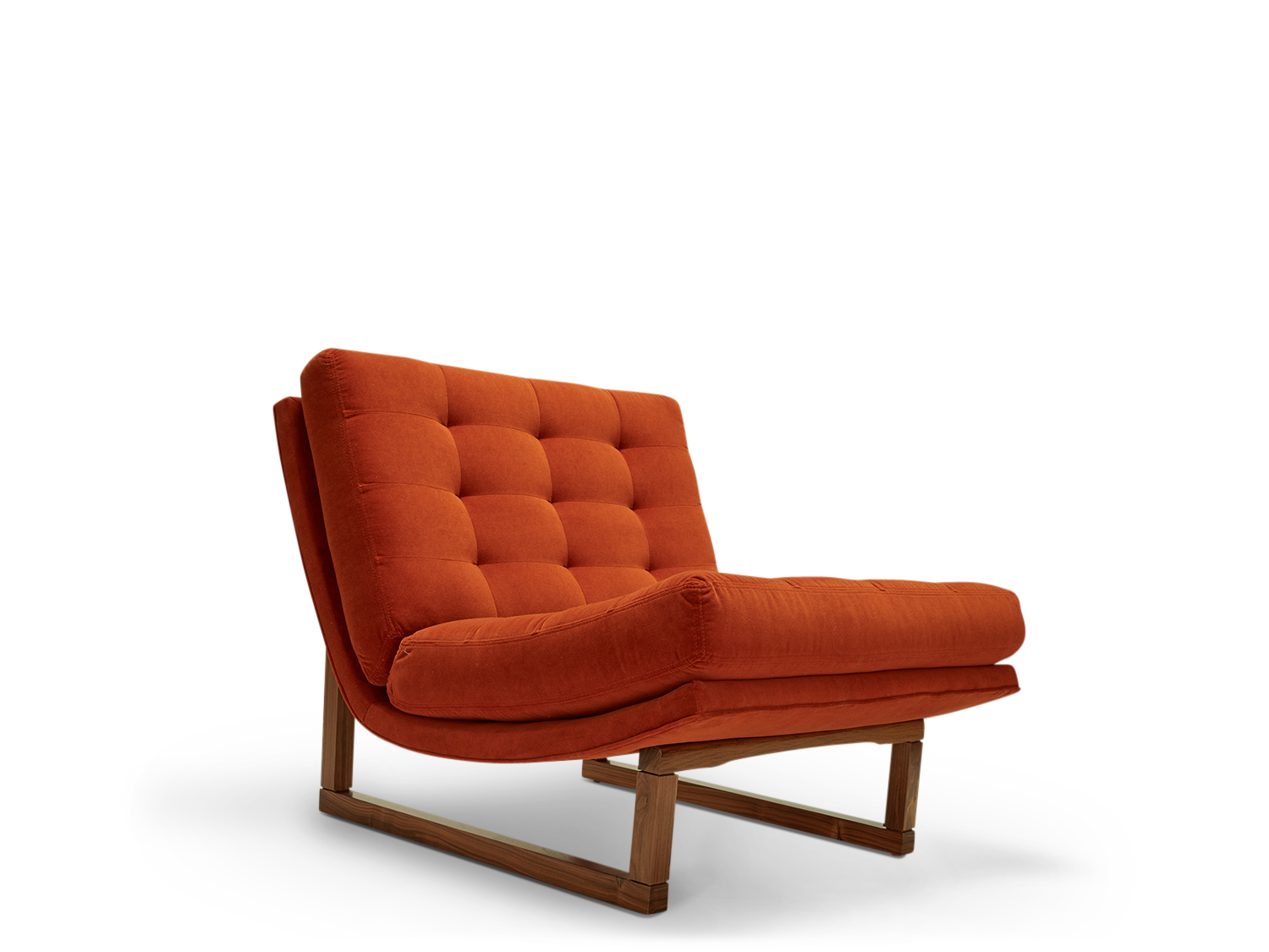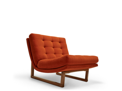 The Griffin Chair is a wide, armless lounge chair that features biscuit tufting. The base is solid American Walnut or White Oak.