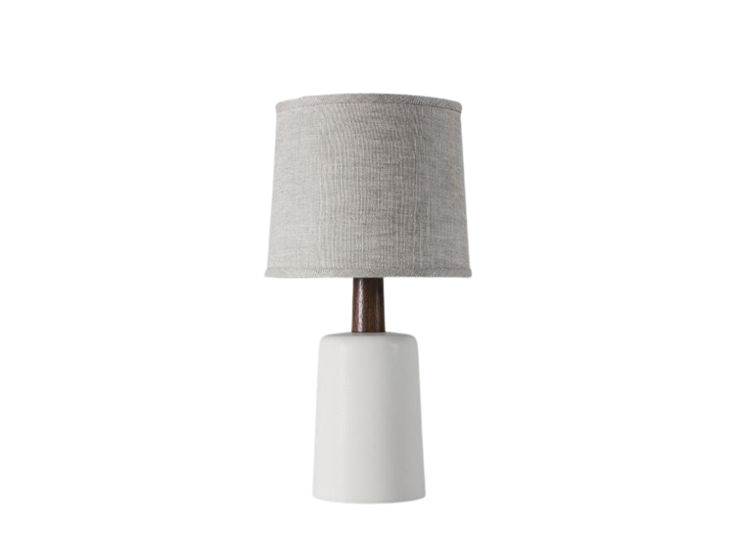 Handcrafted stoneware lamp made in upstate New York by Stone and Sawyer. Please contact showroom for custom glaze options. Images feature satin brass metal, walnut wood, and natural linen shade. Please review lead times and shipping notes in Product Details prior to purchasing.