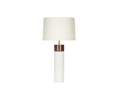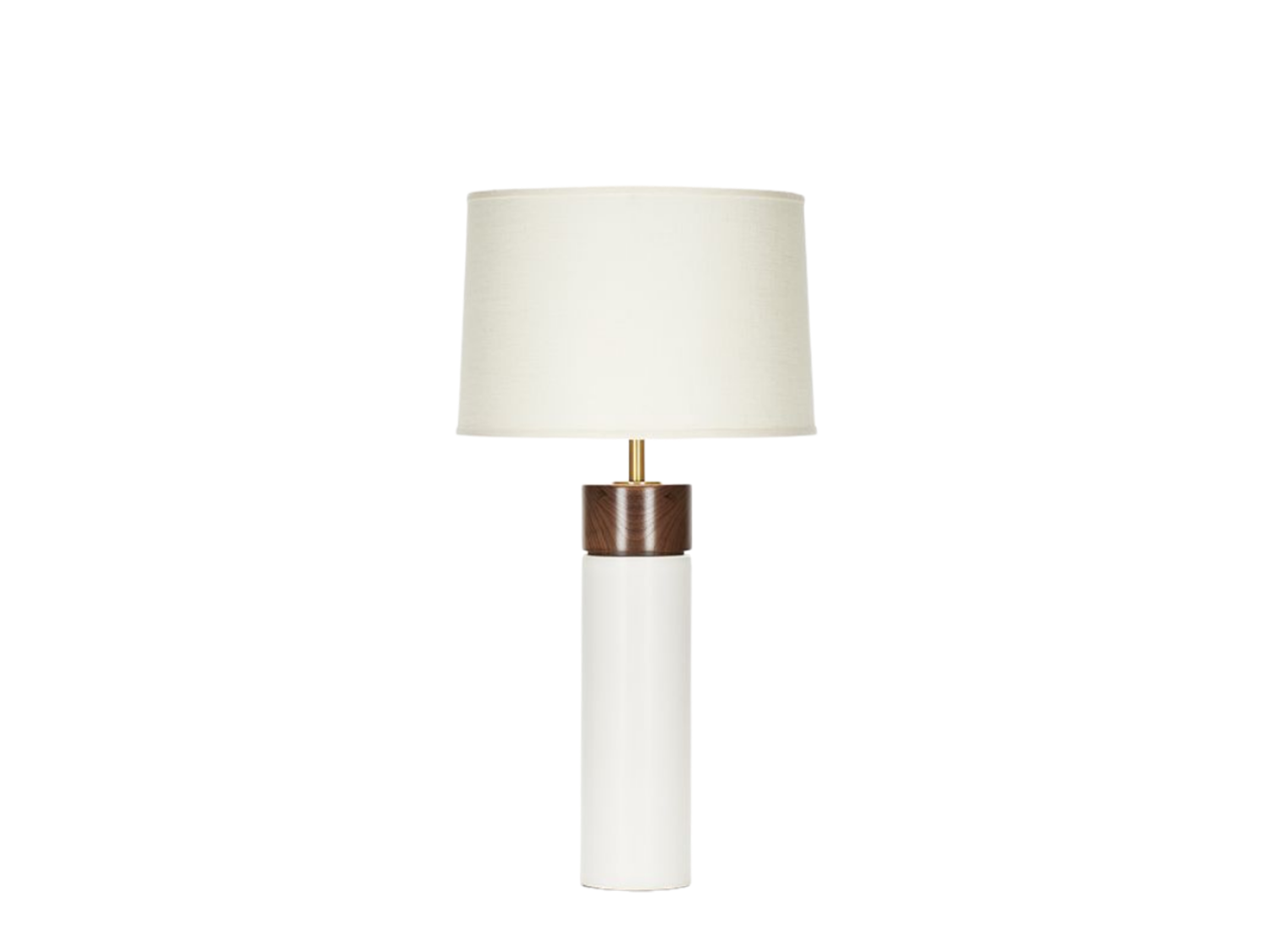 Handcrafted stoneware lamp made in upstate New York by Stone and Sawyer. Please contact showroom for custom glaze options. Images feature satin brass metal, walnut wood, and natural linen shade. Please review lead times and shipping notes in Product Details prior to purchasing.