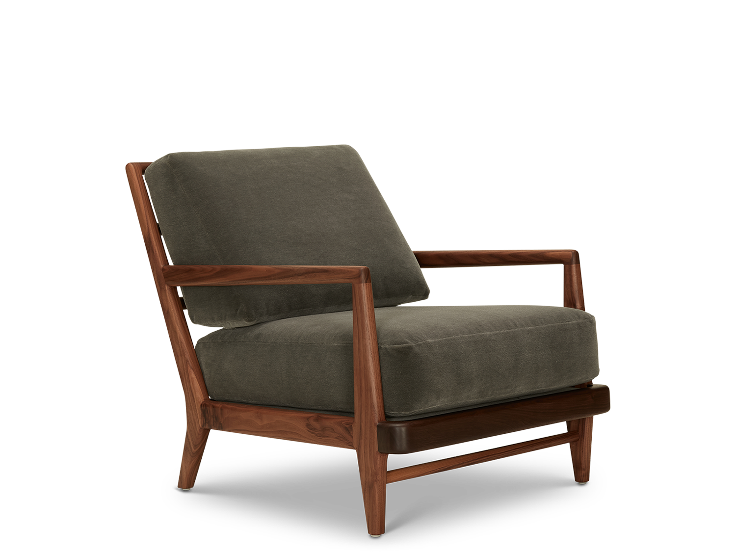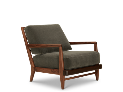 The Headlands Lounge Chair features a sculptural solid wood frame and upholstered cushions. Available with the Headlands Ottoman.