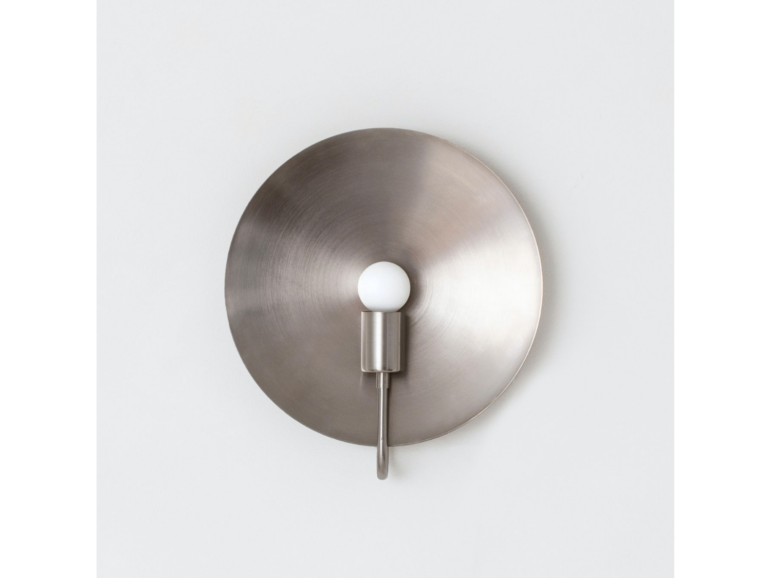 This Sconce celebrates the celestial while maintaining a minimal footprint. A monumental spun-metal disc amplifies the glow from a single point of light, evoking the magnitude of planets on a human scale.
