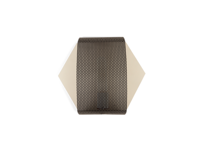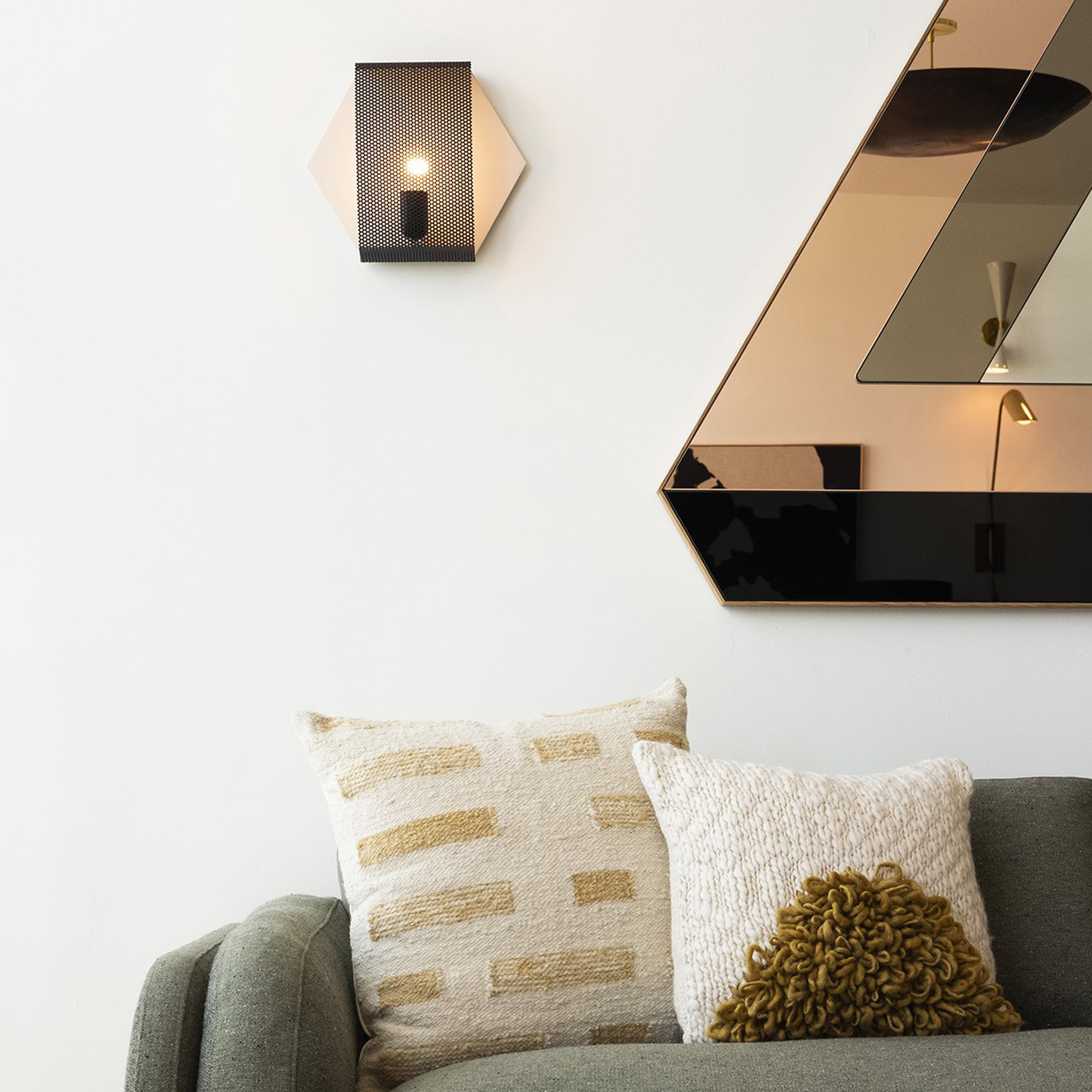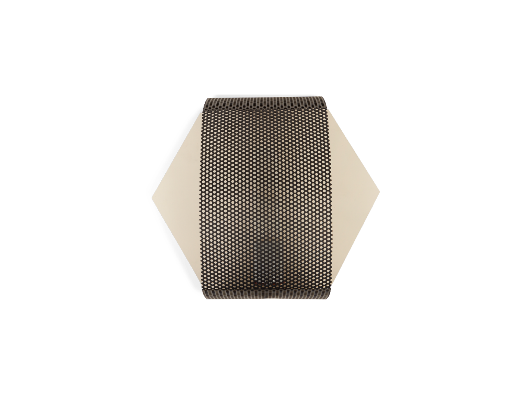 The Hexagon Perforated Sconce features a hexagonal backplate with a curved perforated steel shade and brass details.