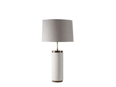 Handcrafted stoneware lamp made in upstate New York by Stone and Sawyer. Please contact showroom for custom glaze options. Images feature satin brass metal, walnut wood, and natural linen shade. Please review lead times and shipping notes in Product Details prior to purchasing.
