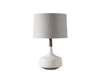 Handcrafted stoneware lamp made in upstate New York by Stone and Sawyer. Please contact showroom for custom glaze options. Images feature satin brass metal, walnut wood, and natural linen shade. Please review lead times and shipping notes in Product Details prior to purchasing.