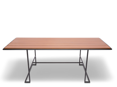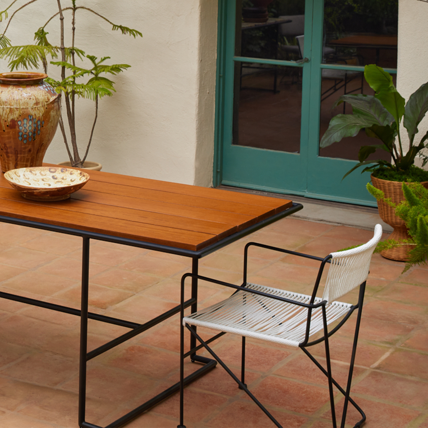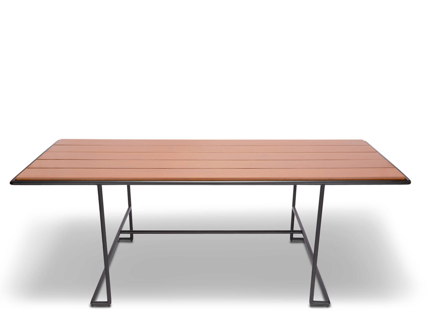 The Hinterland Dining Table features a powder coated iron tube base with a slatted teak top. Suitable for indoor and outdoor use. View complete Hinterland Collection.