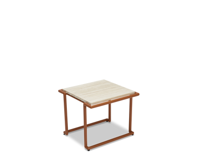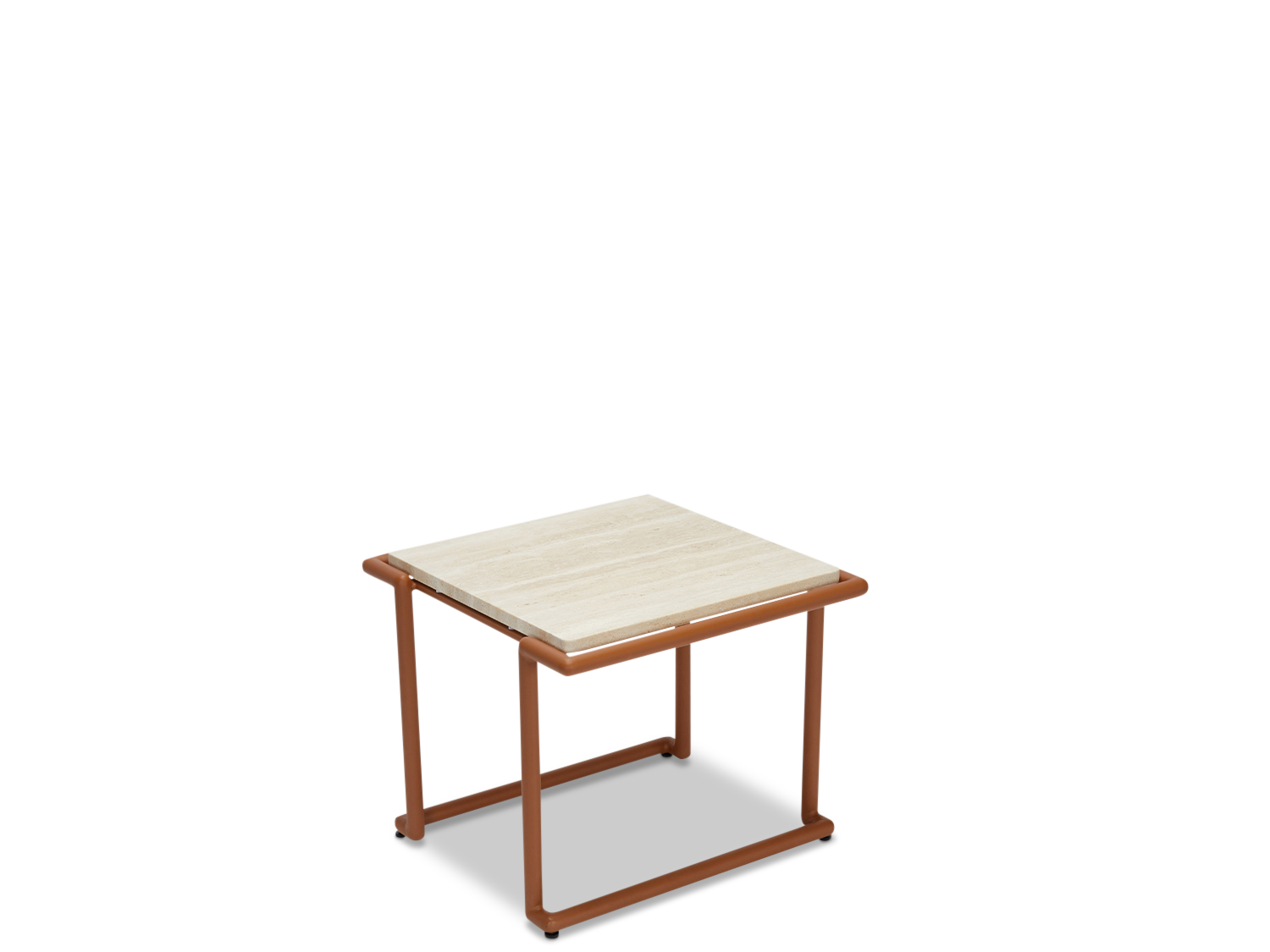 The Hinterland Side Table features a powder coated iron tube base and choice of 3 different tops; teak slat, stone, or a cast tempered glass with a corduroy pattern. Suitable for indoor and outdoor use.