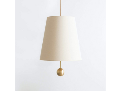 The House Cord Pendant makes a bold statement via an iconic domestic form. Creating a graphic beam of light both above and below, the shade’s interior and exterior is swathed in natural linen. An oversized metal ball drops beneath the fabric shade, grounding the form and reflecting light from the three bulbs above. Please review lead times and shipping notes in Product Details prior to purchasing.