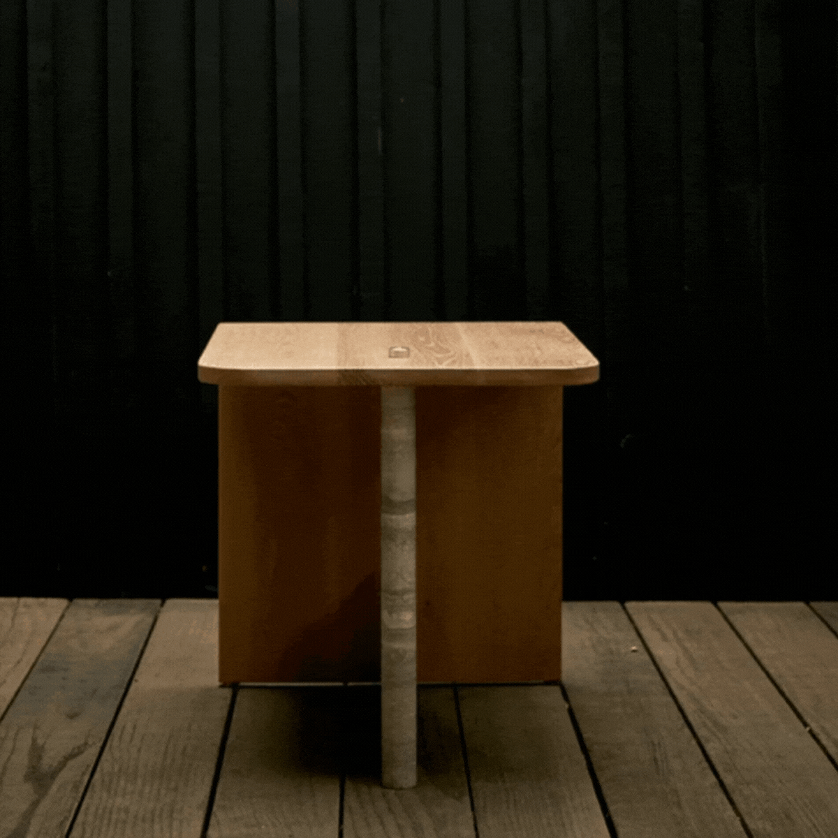 The Huxley Side Table features a waterfall oak or walnut top, a stepped stone base and metal details.